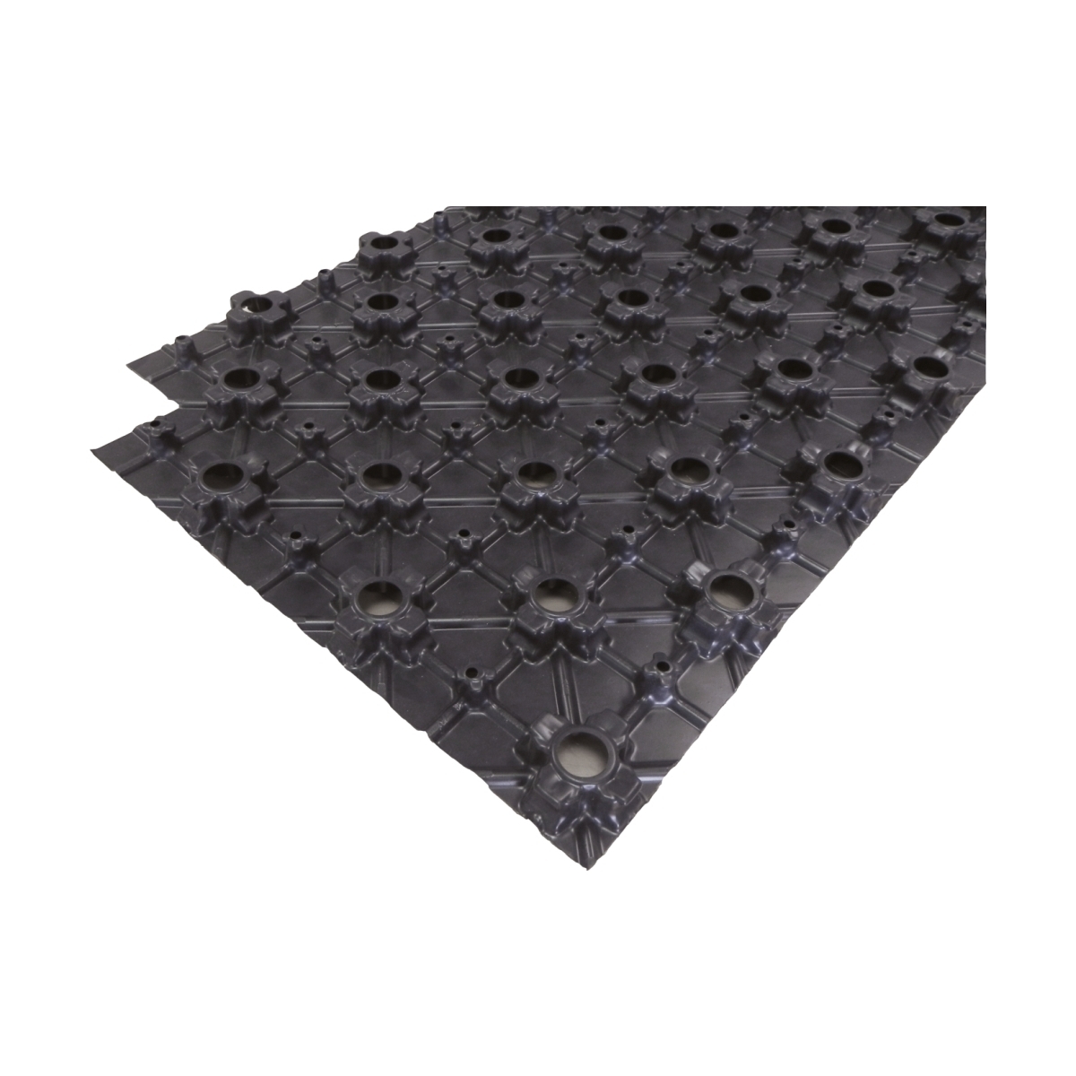 U20 PS-floie med. Integrerade rörhållare 1050 x 650 mm, Självhäftande. Användbart område:1000 x 600 mm. Skivans totala höjd inklusive den integrerade rörhållingsdelen: 16 mm. Avstånd mellan rörhållare: 50 mm (90º) / 70 mm (45º). Överlappande termoformande folie med förlimmad underside. Beroende på utjämingsskiktet tjocklek uppnås en höjd utan golv på ca 20 mm.
