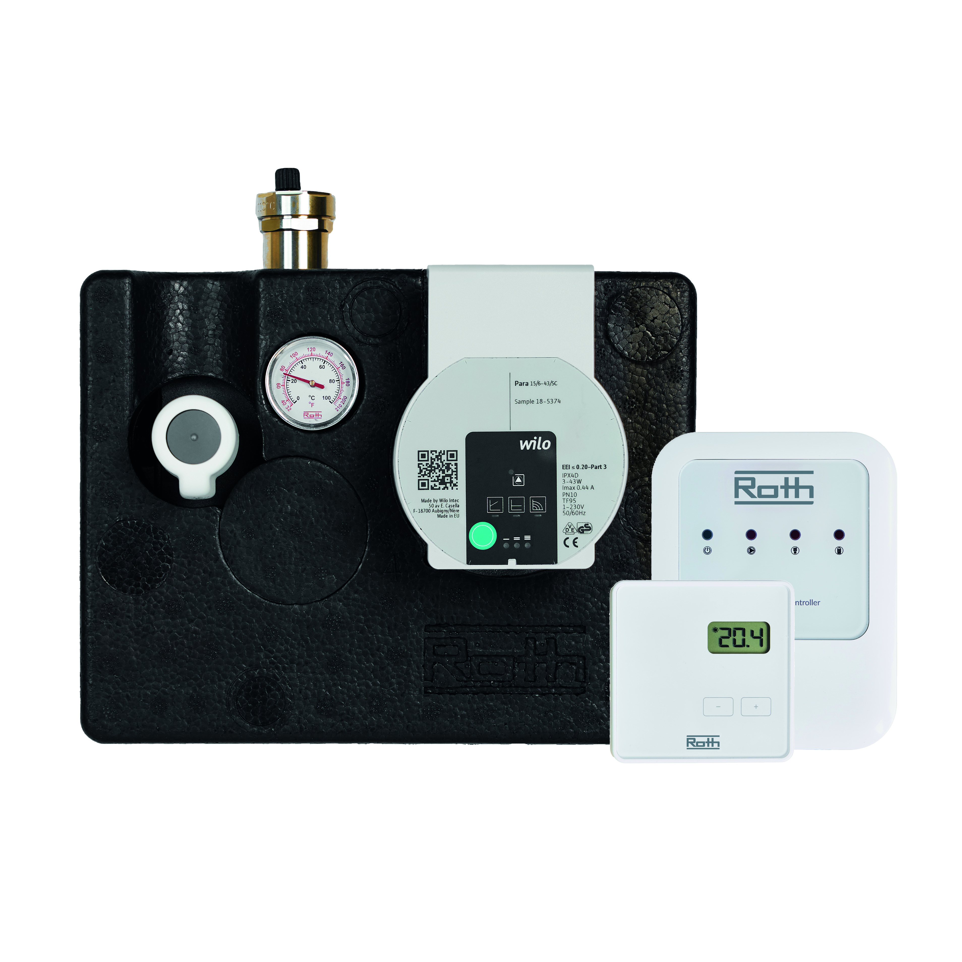 Roth minishunt GVC, trådlösMed elektronisk rumsreglering 5 - 30°C.Max. två lika långa slingor genom användning av duofördelare.Kapacitet: Upp till 50 m² vid 2 slingor.Max yta per slinga beror på val av rördimension och förläggningssätt.