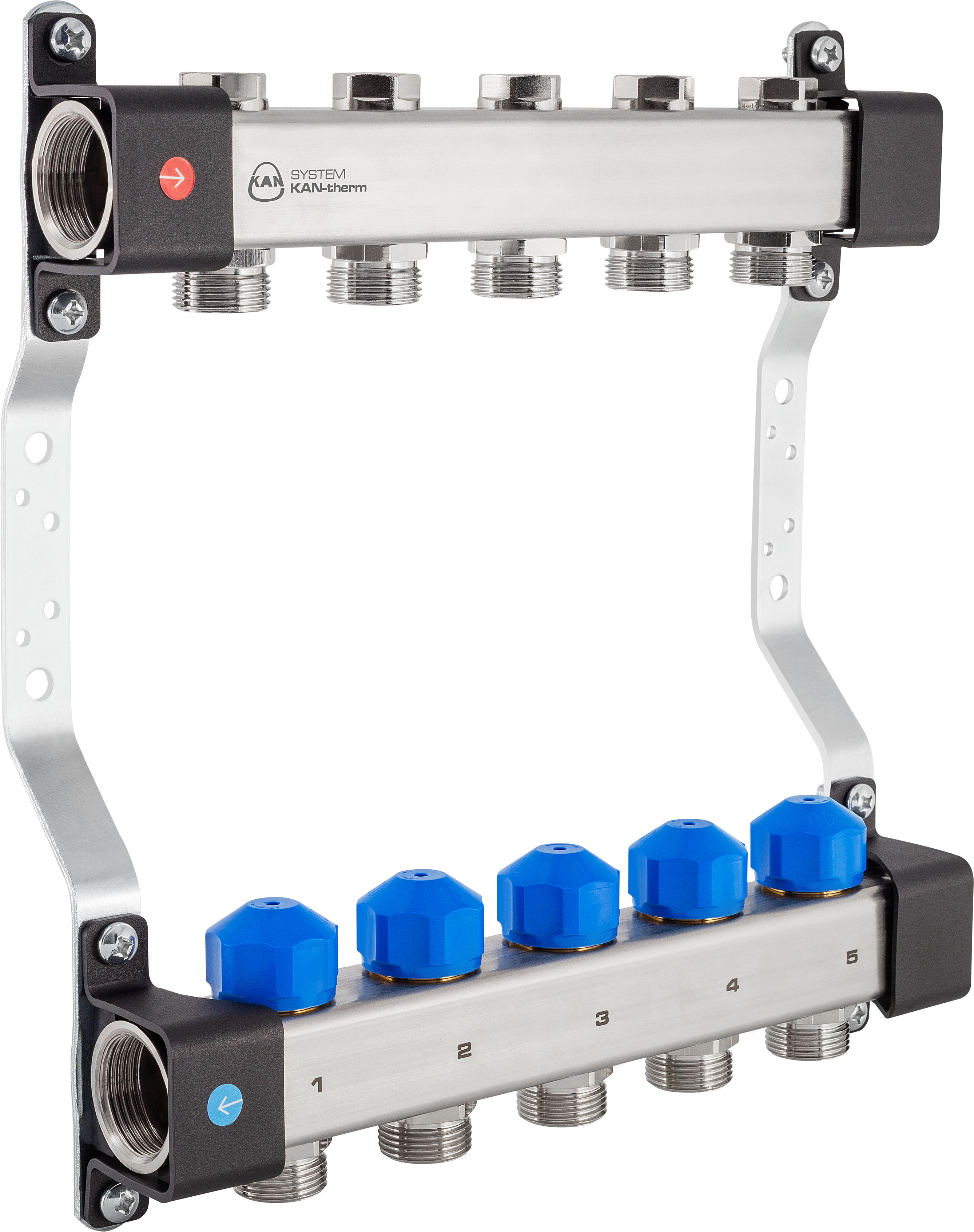 Golvvärmefördelare InoxFlow 1 1/4" i rostfritt stål med injusteringsventiler och handmanöverdon (serie UVS)