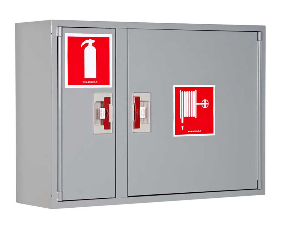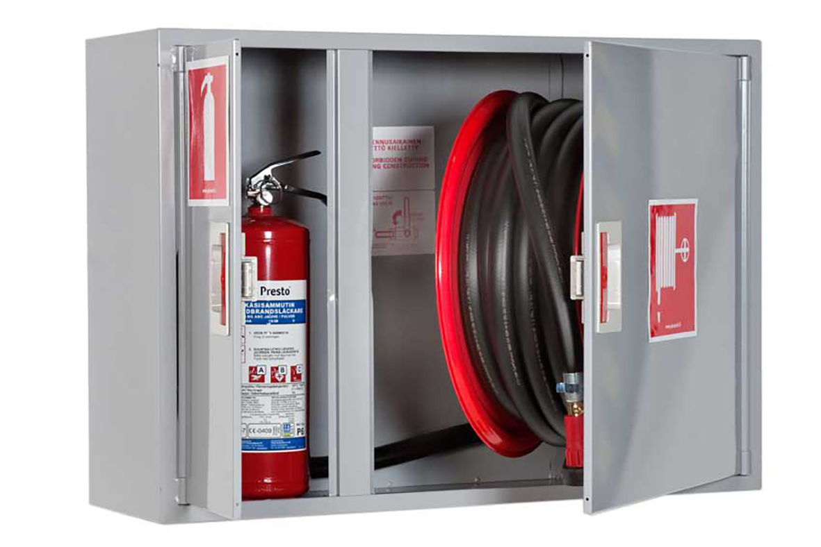 Brandpostskåp för väggmontage med 25mm/30m brandpostslangen, inkl. strålrör och ventil, 990x690x290mm. Plats för bransläckare.