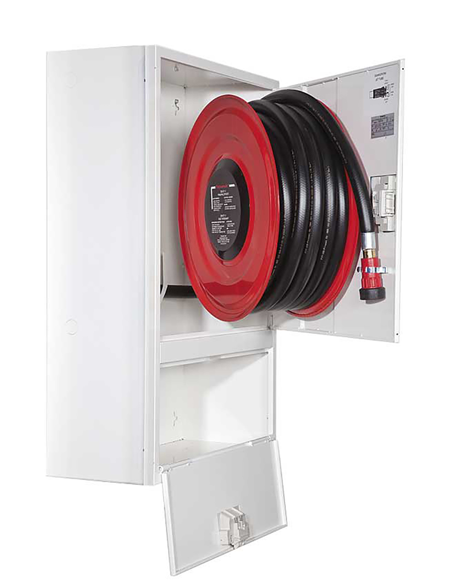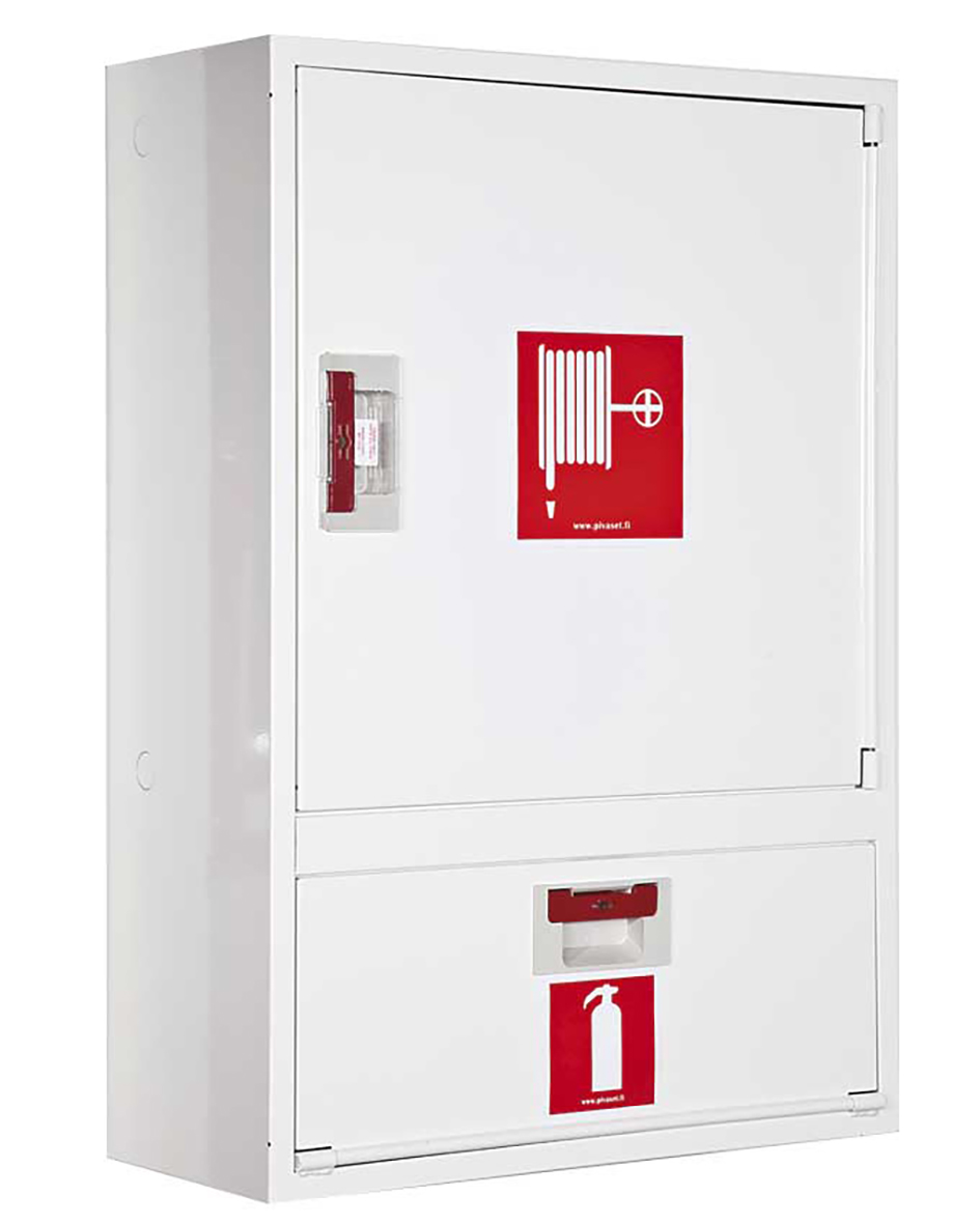 Brandpostskåp för väggmontage med 19mm/30m brandpostslangen, inkl. strålrör och ventil, 690x990x290mm. Plats för bransläckare.