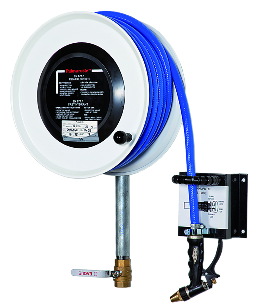 Kompakt stålslangrulle med väggfäste, slangstyrning, ventil, anslutningsrör och spolningsknap, 390x250mm