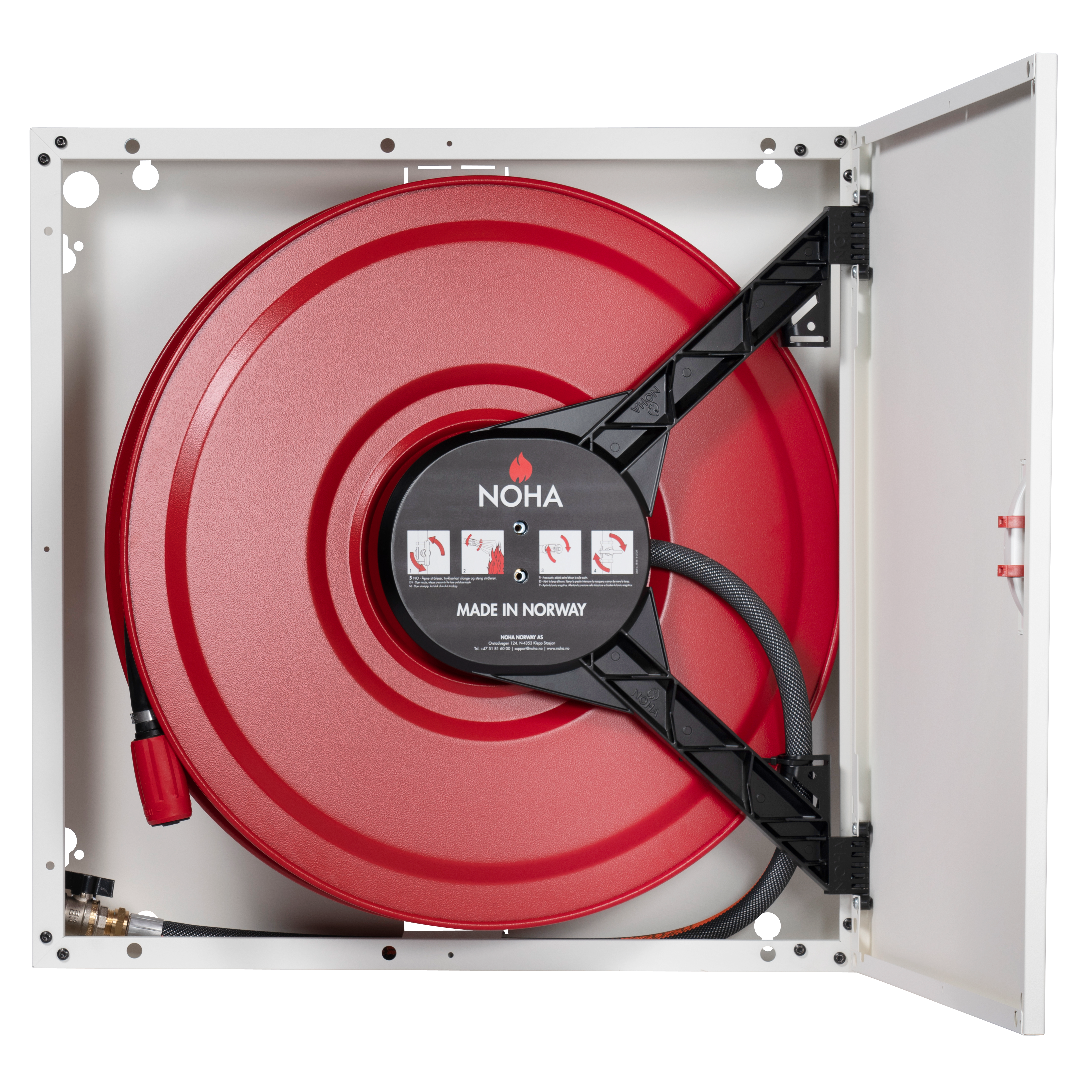 Brandpost i skåp med svart slang och manuell ventil, för infällning i vägg eller montering på vägg. Enligt SS-EN 671-1 CE-märkta.