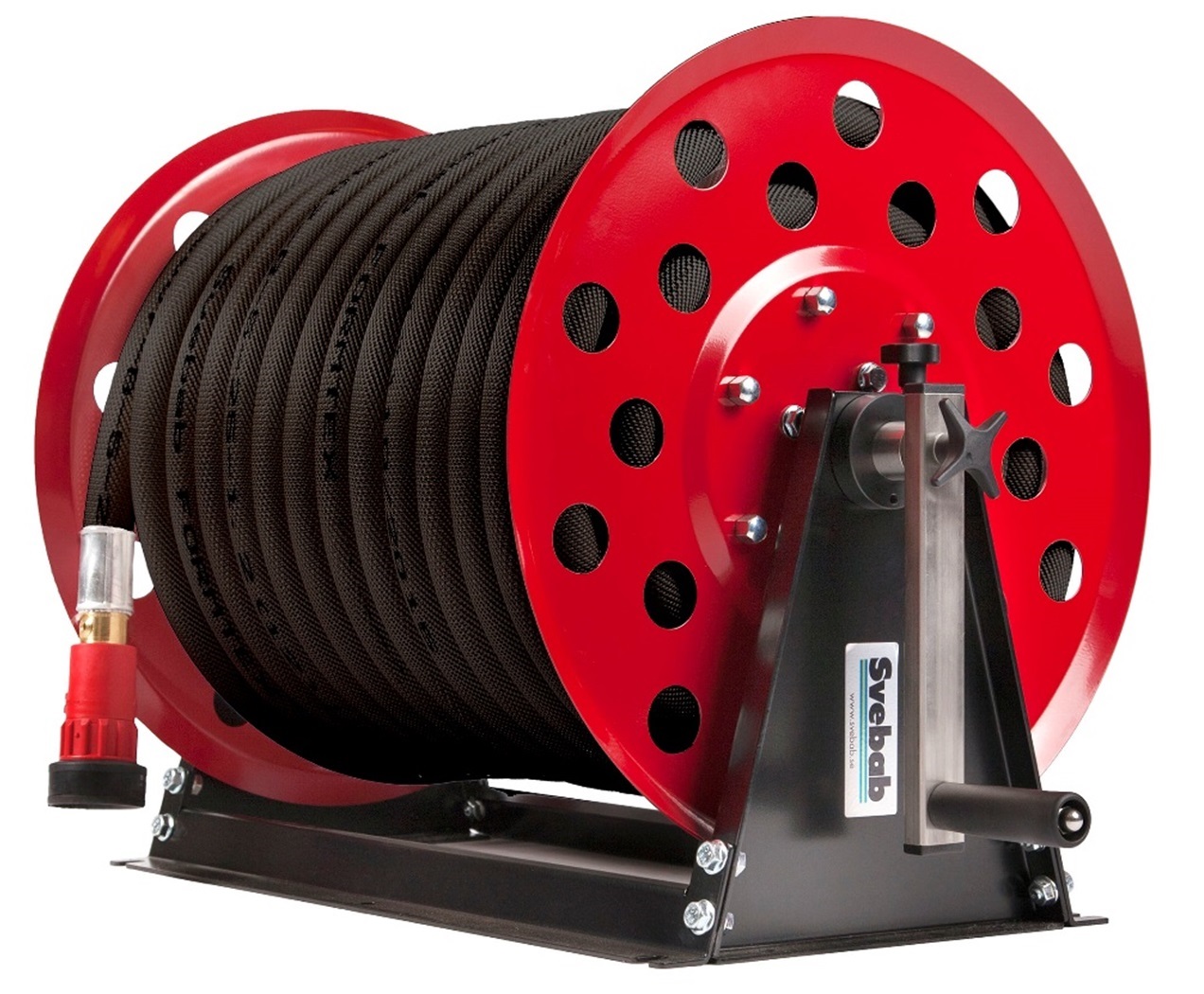 Svebab Industrislangrulle/Brandpost i rödlackerad stålplåt med 50m 25mm:s Formtex lättviktsslang. Mått: 640x440x500 (B x H x D)