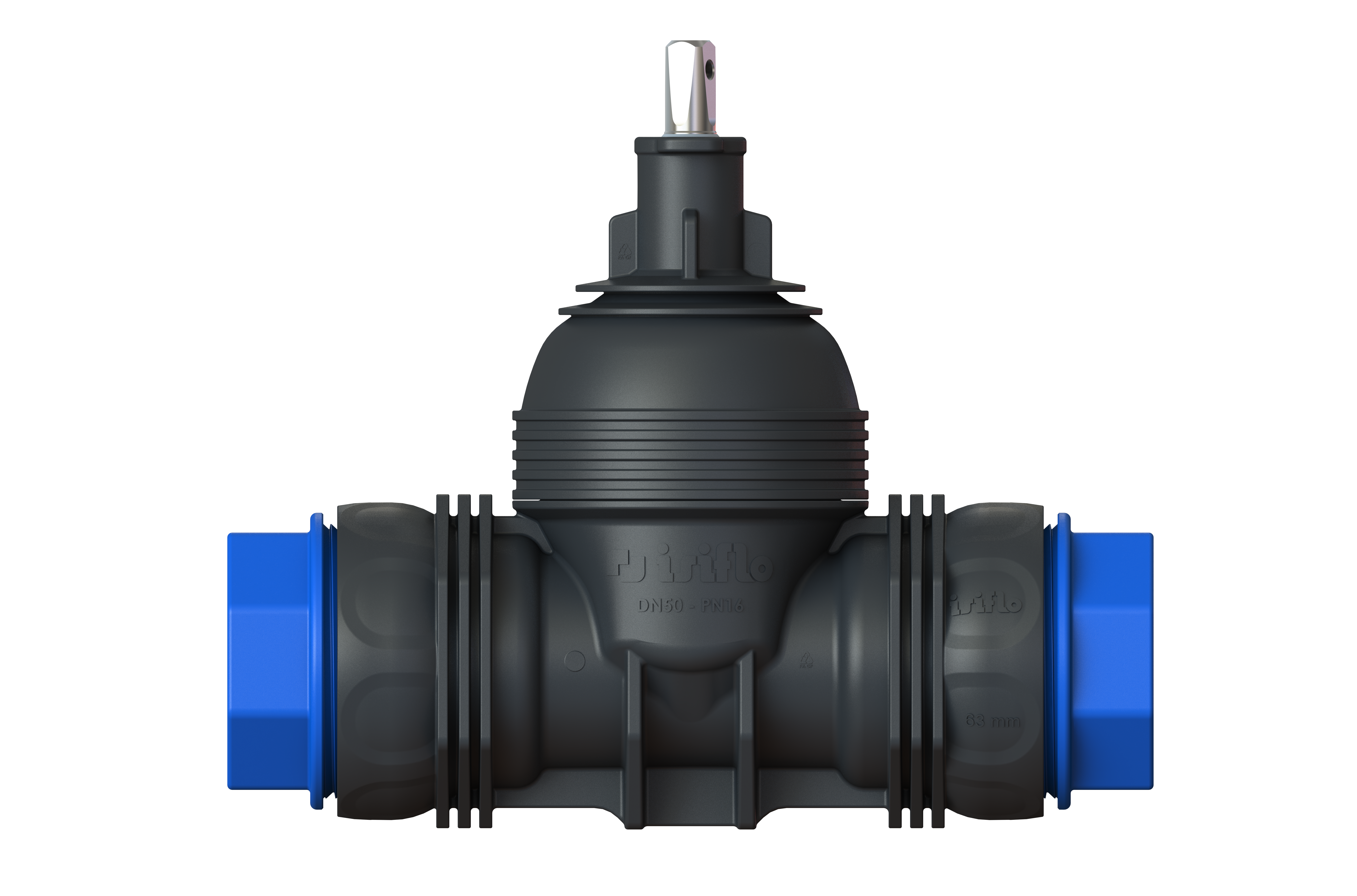Isiflo T 200 Servisventil 63x63 i komposit, med spindel i syrafast material. Klämringskoppling för PE/PVC rör.