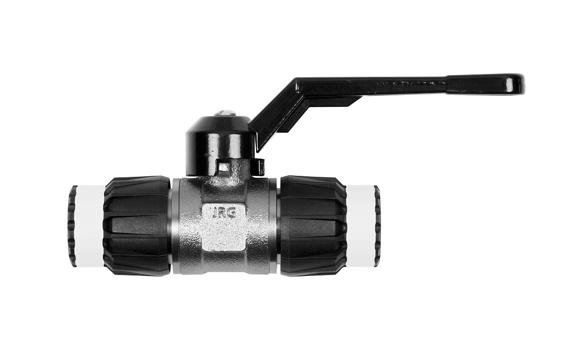 Av rödgods, med svart handtag och kongreppskopplingar av plast, kulan ytbelagd med PTFE, PTFE-tätningar, avsedd för vatten*, tryckluft och vacuum. Temperaturgränser: -20°C upp till +95°C