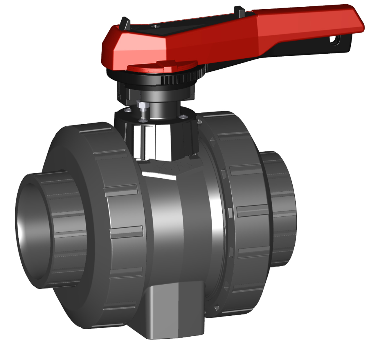 Kulventil Typ 546 av PVC-U med limmuffar. Tätning av EPDM, kultätning av PTFE. Med integrerade gänginsatser för infästning. Låsbart rött handtag. Godkännande: Byggvarubedömning BVB ID 129220.