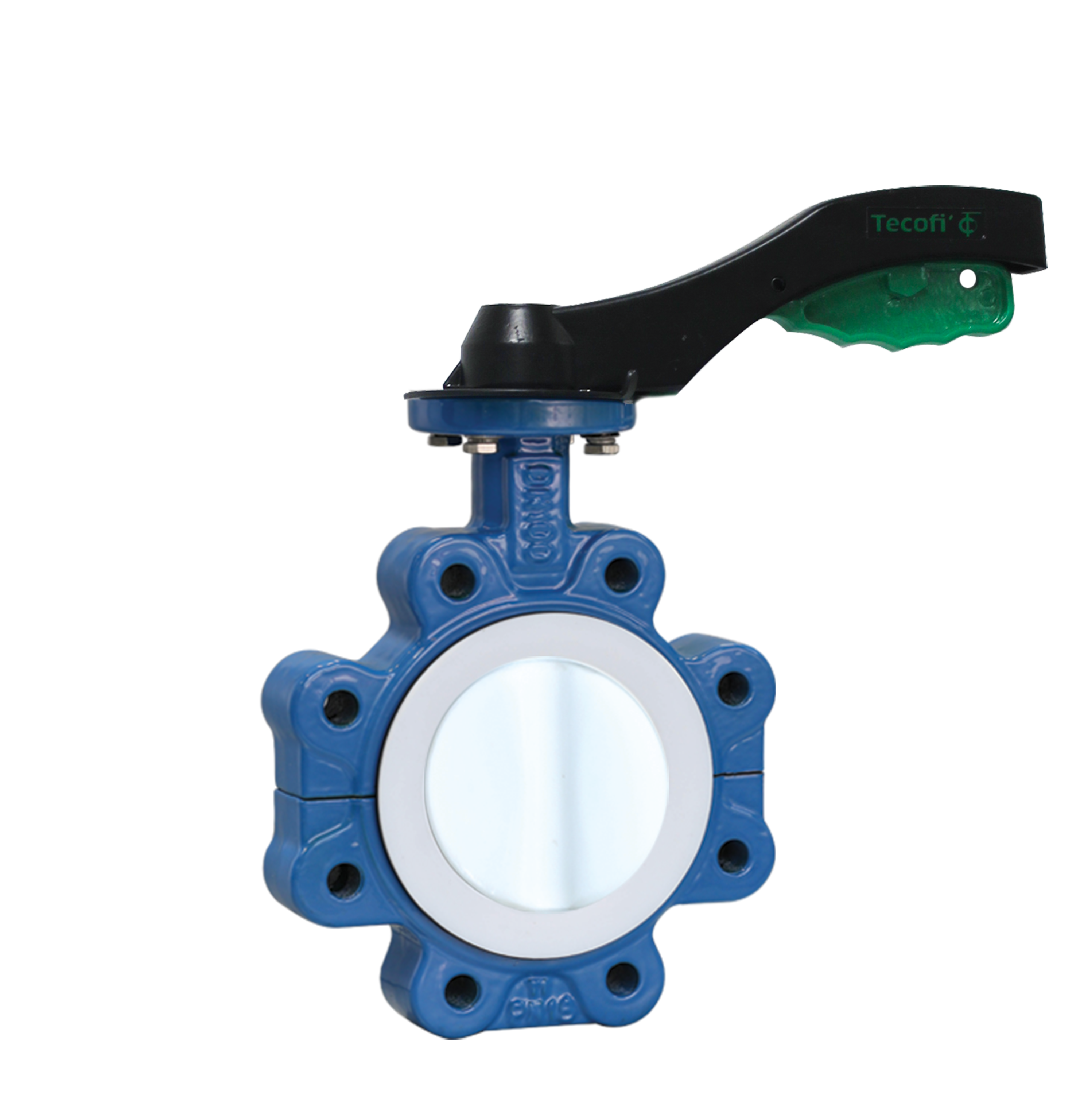 Vridspjällsventil PA 203 med PTFE-foder, LUG modell för montering mellan flänsar, låsbart handtag. ISO 5211 toppfläns för direktmontage av växel eller manöverdon.