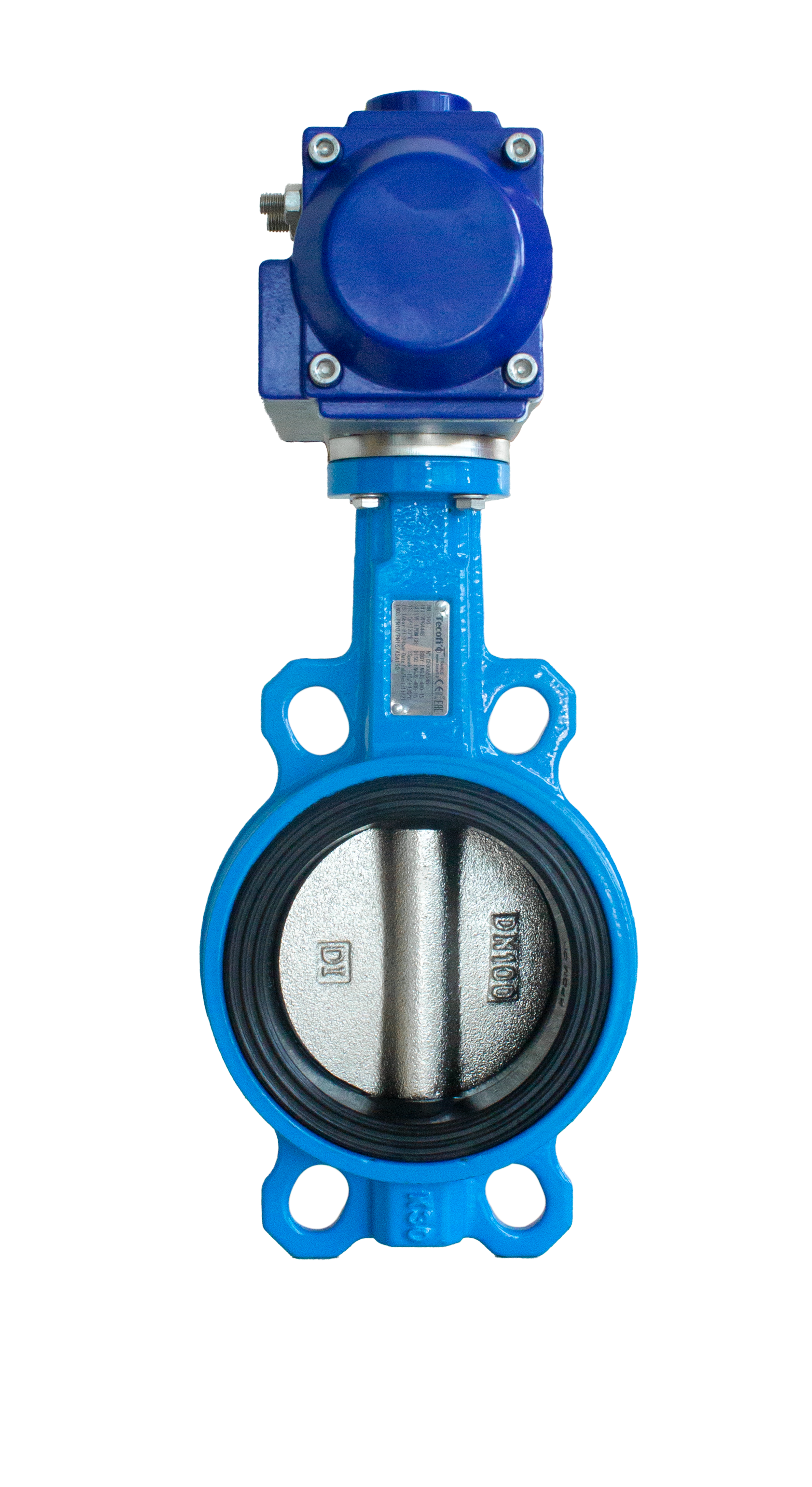 Vridspjällsventil PA 204 med Nitril-foder, Wafer modell för inspänning mellan flänsar, Hög hals anpassad för isolering med monterat dubbelverkande manöverdon.