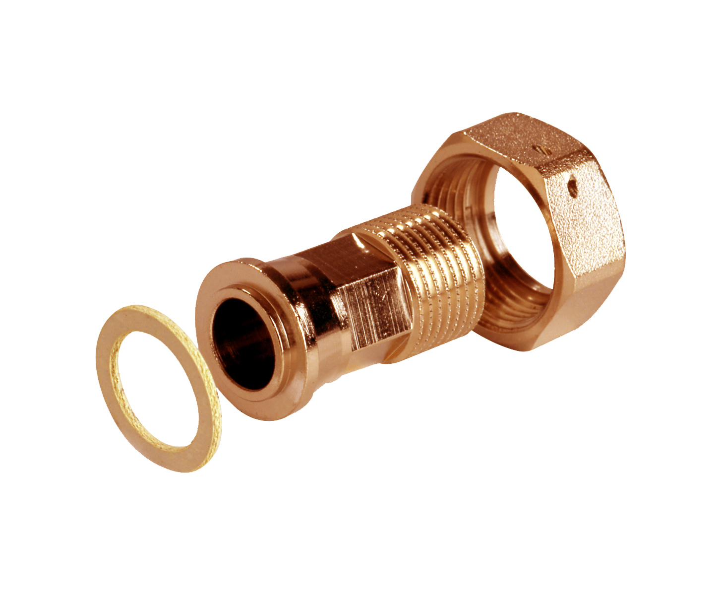 Anslutningskoppling med lös mutter och planpackning. Möjlighet till plombering via hål i mutter.