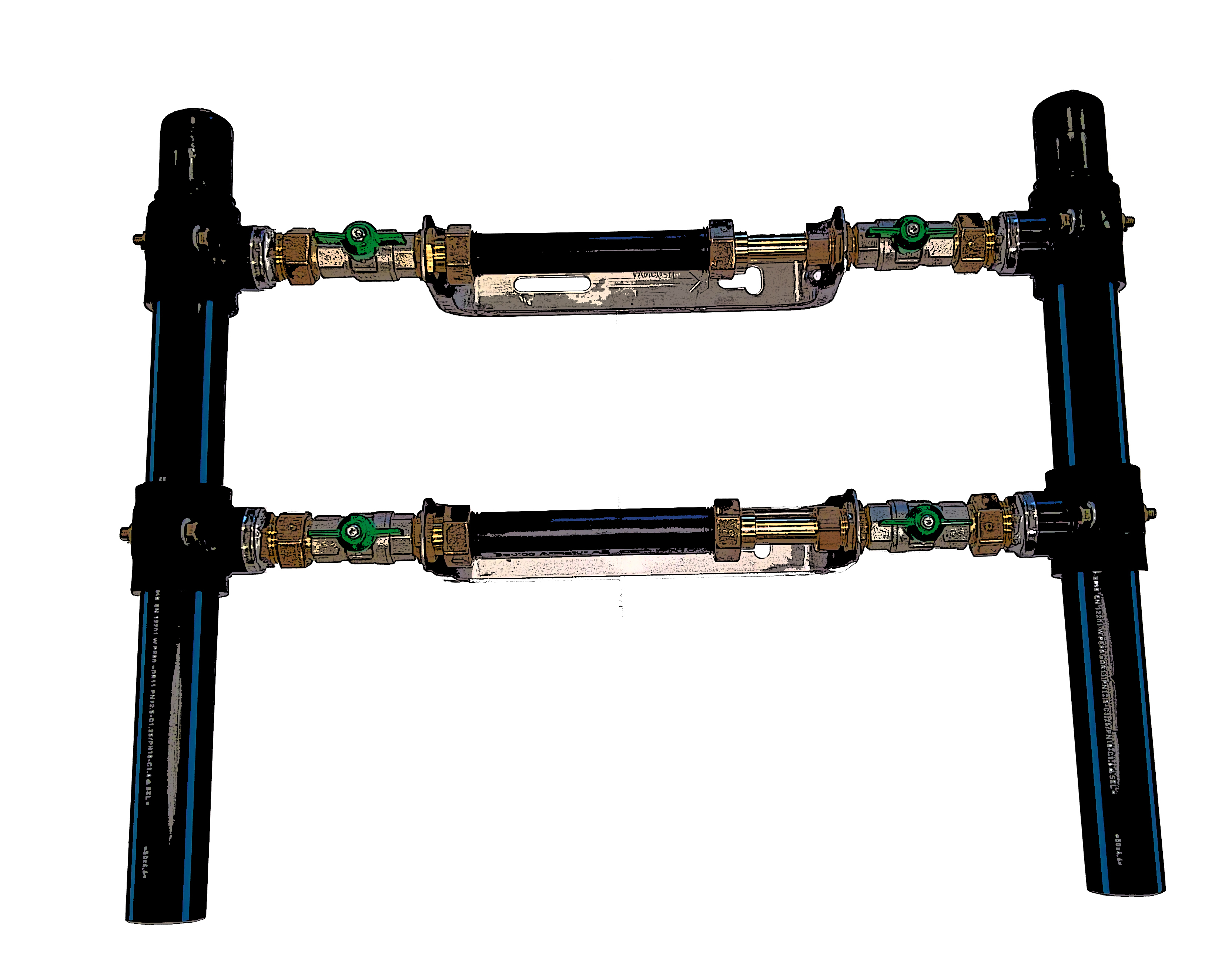 För montering ex. i brunnar, radhus , mm. Dim. 50 PE i stommen, avstängningsventil före och efter varje mätarkonsol.