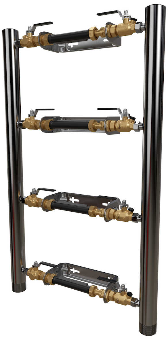 LK Parallellkopplad Vattenmätarkonsol (LK PVK) för vattenmätare Q3 4 med bygglängd 190-220 mm anslutning G25. LK PVK finns i många olika modeller med varianter för enbart 190 mm mätare och 190-200 mm mätare. Genom att stänga ventil före och efter en vattenmätare kan denna demonteras samtidigt som vattenflödet är i gång genom de andra mätarna. LK PVK levereras alltid med en inbyggd backventil i ventilen efter mätaren. Denna backventil är även kontrollerbar och går även att byta ut om den skulle gå sönder. På LK PVK går det även att välja om man vill inkommande uppifrån eller nerifrån detsamma gäller efter mätarna. LK Passbit 190mm som levereras med alla LK PVK är avsedd för att kunna sitta permanent på kallvatten, men bara temporärt på varmvatten. Fördelarna och konsolerna till vattenmätarna är tillverkade i rostfritt stål.