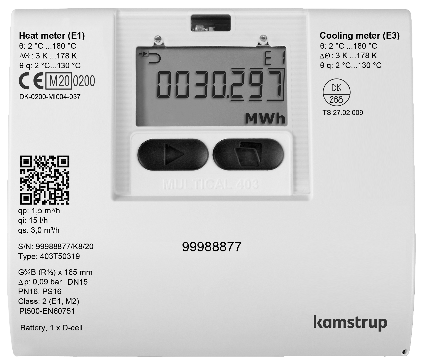 Värmemängdsmätare M-ULTICAL® 403 Qp2,5, G1x190 mm 1,5 m dykrörsgivare (par), 65 mm rfr dykrör, batteri
