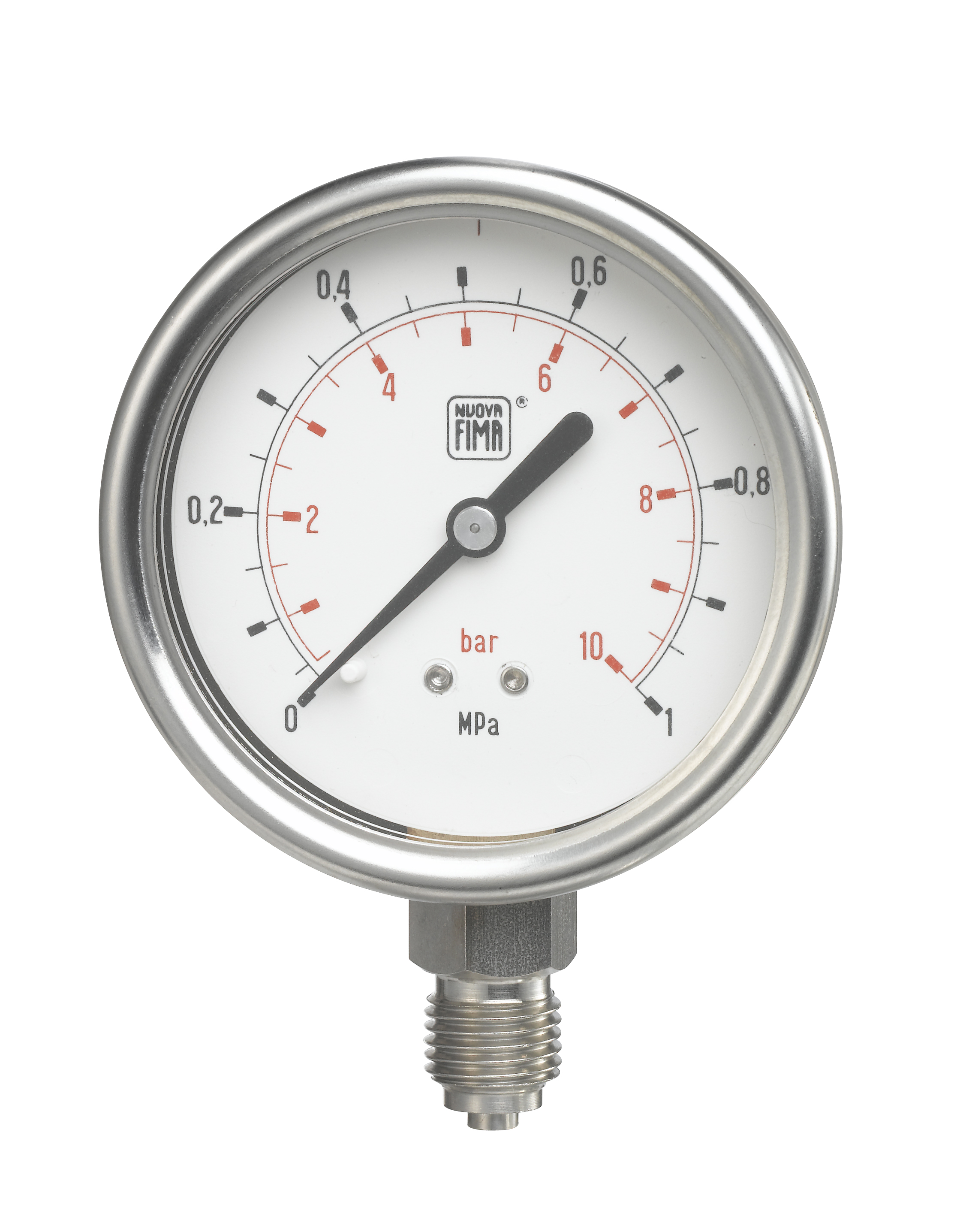 Tryckmätare typ MGS18 63mm med hus i rostfritt stål och mediaberöda delar i syrafast stål , dämpvätskefylld för applikationer där tryckstötar och vibrationer förekommer för aggressiva vätskor och gaser