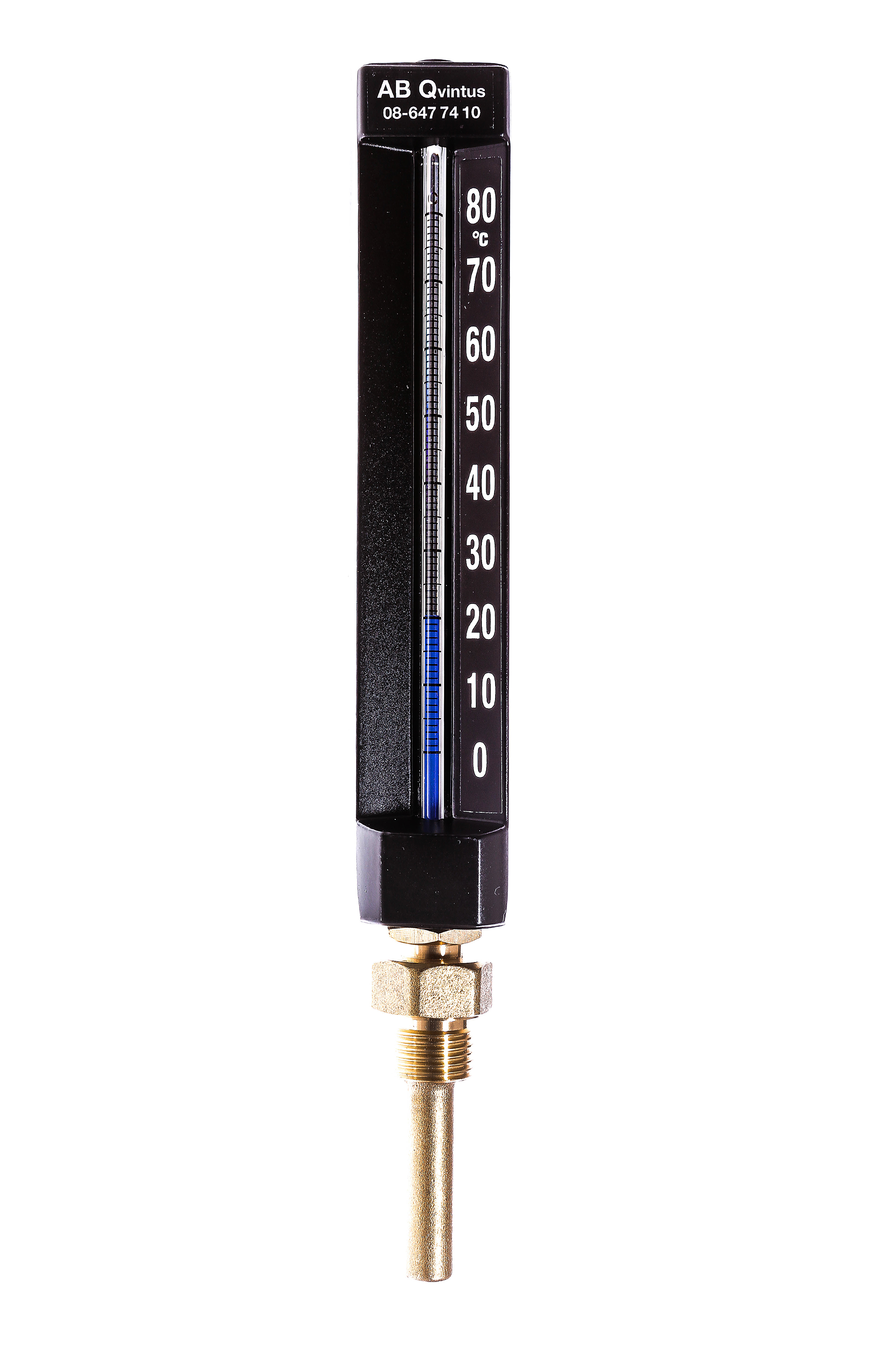 Industritermometer i pressgjuten aluminium. Blå prismatisk vätska. Helsvarvat dykrör
