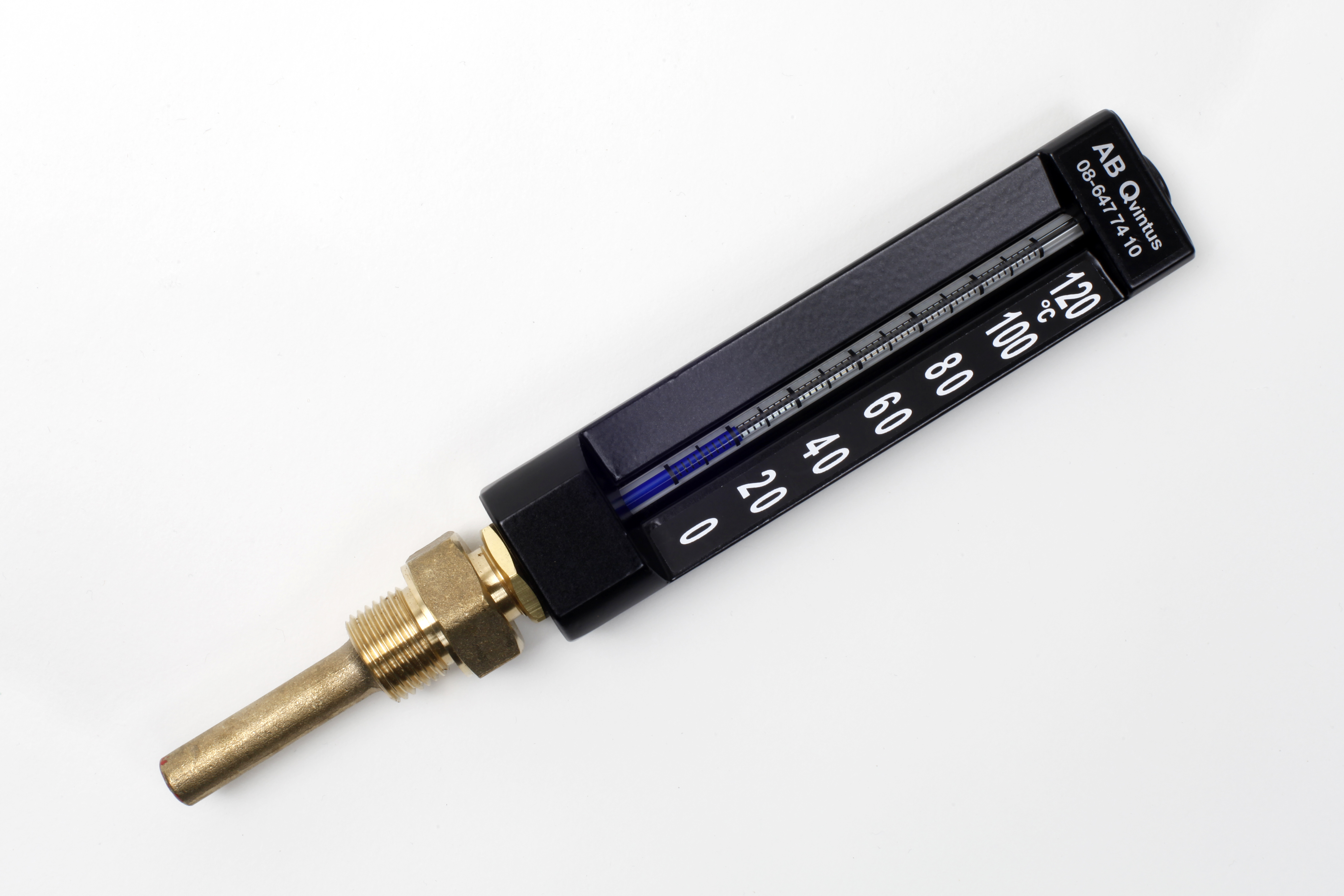 Industritermometer i pressgjuten aluminium. Blå prismatisk vätska. Helsvarvat dykrör