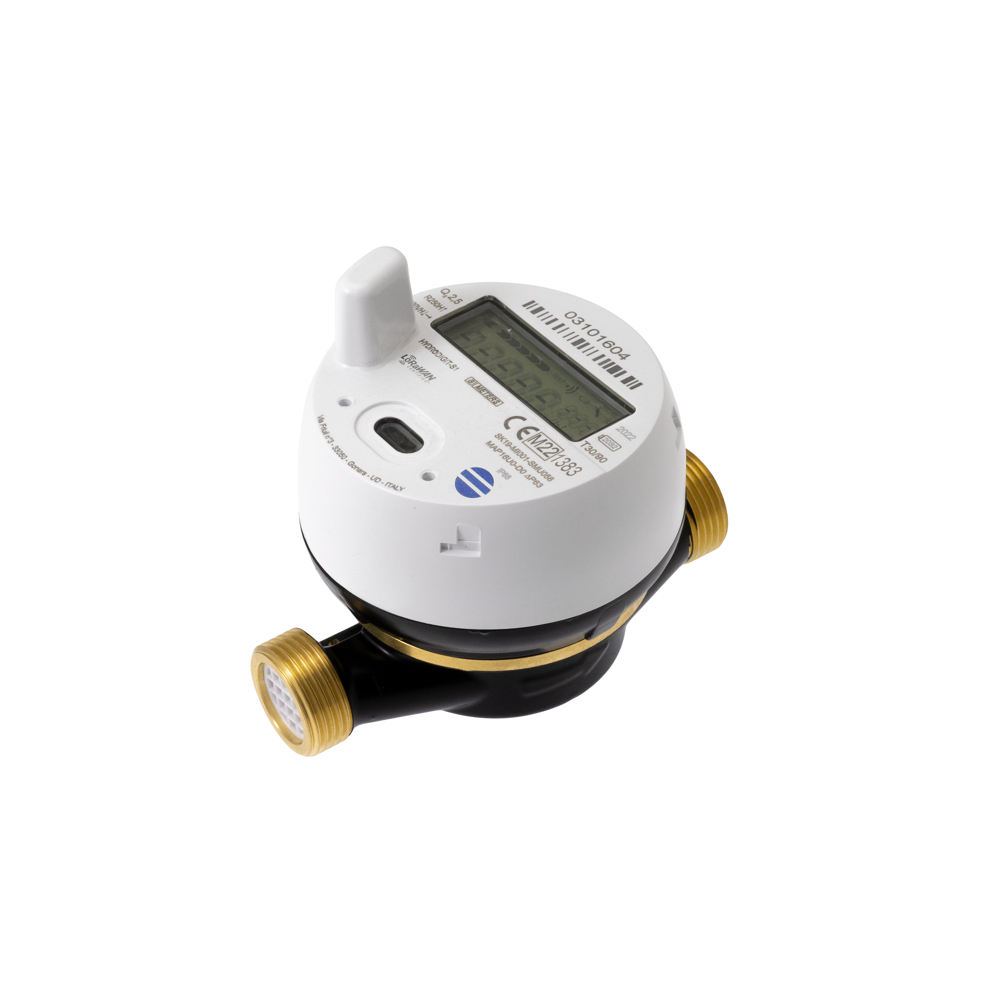 Semi-induktiv vattenmätare för kallt- eller varmtvatten med LCD display som visar stor mängd data. Trådlös LoRa WAN som sänder