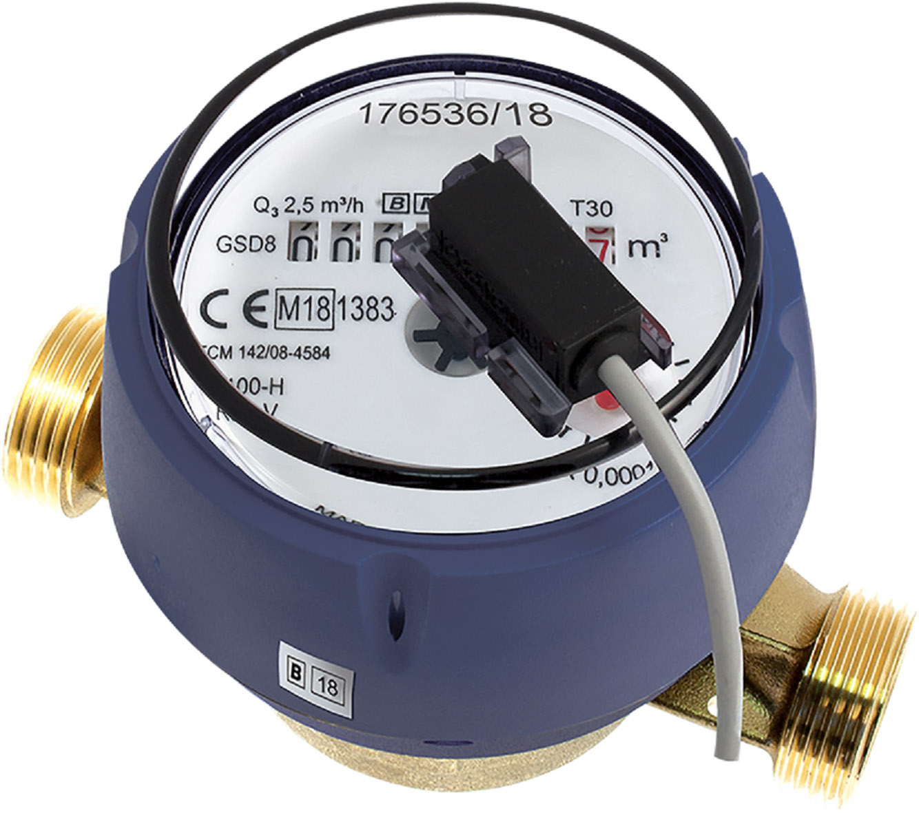 Varmvatten (GSD8-R AC) och kallvattenmätaren (GSD8-R AF) BMeters vattenmätare med pulsutgång är en vattenmätare väl lämpad att mäta små vattenförbrukningen i alltifrån lägenheter och radhus till lite större förbrukningar såsom mindre flerbostadshus eller industrifastigheter. Mätaren levereras vanligtvis med monteras pulsutgång (REED) och 3 m anslutningskabel. Då mätaren är modulärt uppbyggd kan den levereras utan pulsgång samt kan då lätt i efterhand kompletteras med själva pulsanslutningen. Mätarens pulsutgång kan lätt anslutas till olika omvandlingsmoduler för att passa in i diverse mätvärdesinsamlingssystem bl.a. BMeters modul RFM-TXE för trådlös M-Buskommunikation eller PadPuls för trådansluten M-buskommunikation. Mätaren finns i DN15 med flödesområde Q3 2,5 och DN20 med flödesområde Q3 4,0 m3/h. Mätaren är MID typgodkänd som debiteringsmätare (R=100 och option R=160). Mätaren kan monteras både horisontellt och vertikalt. Varmvatten (GSD8-R AC) och kallvattenmätaren (GSD8-R AF) är av typen torrlöpande enstrålig vinghjulsmätare utrustad med pulsutgång med 3 m anslutningskabel typ REED kontakt med ett pulstal på 1 liter. Mätaren kan levereras utan pulsanslutning för att i efterhand kompletteras med pulsanslutning. Ansluts mätarens pulsutgång till M-busmoduler RFM-TXE (trådlös M-buskommunikation) eller PadPuls (trådansluten M-buskommunikation) kan mätaren lätt integreras i BMeters fjärravläsningssystemet HYDROLINK men kan även lätt monteras i andra M-bussystem eller andra typer av kommunikations- system med moduler för pulskonvertering. Kommunikationsmodulerna måste sannolikt konfigureras med pulstal och mätarställning m.m. Den uppmäta volymen registreras på ett rullsifferräkneverk (m3) med 5 heltal och 3 decimaler. För enklare och säkrare optisk avläsning kan mätarens räkneverk vridas 360°