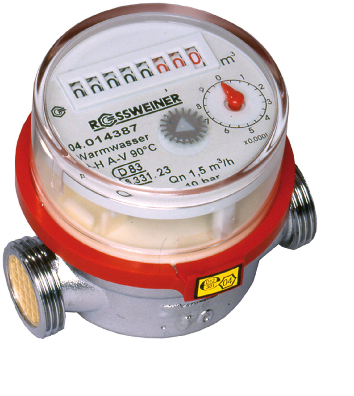Rossweiner 683W Lägenhetsmätare varmvatten max 90°C Qn 1,5, Dn15/R20 torrlöpande bygglängd 80mm förkromade monteras liggande eller stående.
