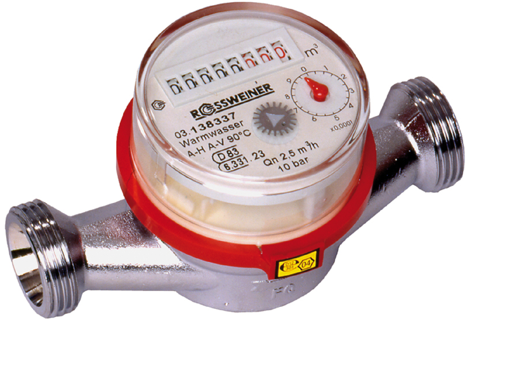 Rossweiner 688W Lägenhetsmätare varmvatten max 90°C Qn 2,5, Dn20/R25 torrlöpande bygglängd 130mm förkromade monteras liggande eller stående.