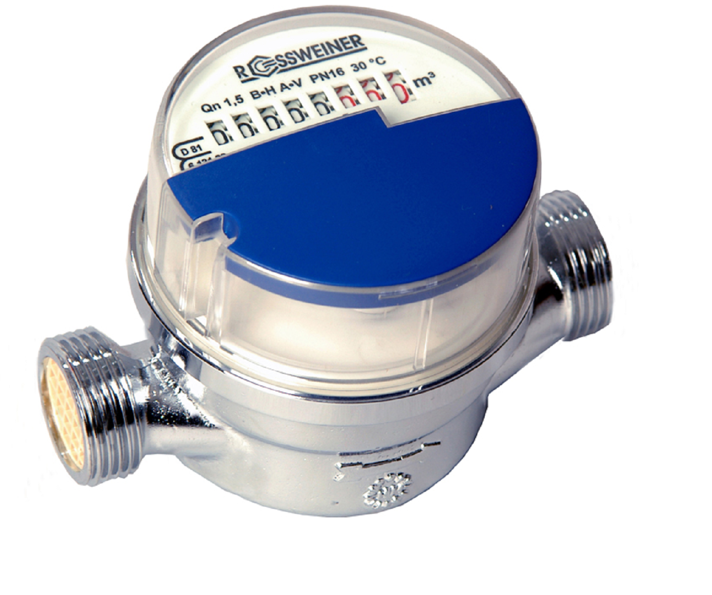 Rossweiner 688K Modularis lägenhetsmätare kallvatten max 30°C Qn 2,5, Dn20/R25 torrlöpande bygglängd 130mm förkromade monteras liggande eller stående.