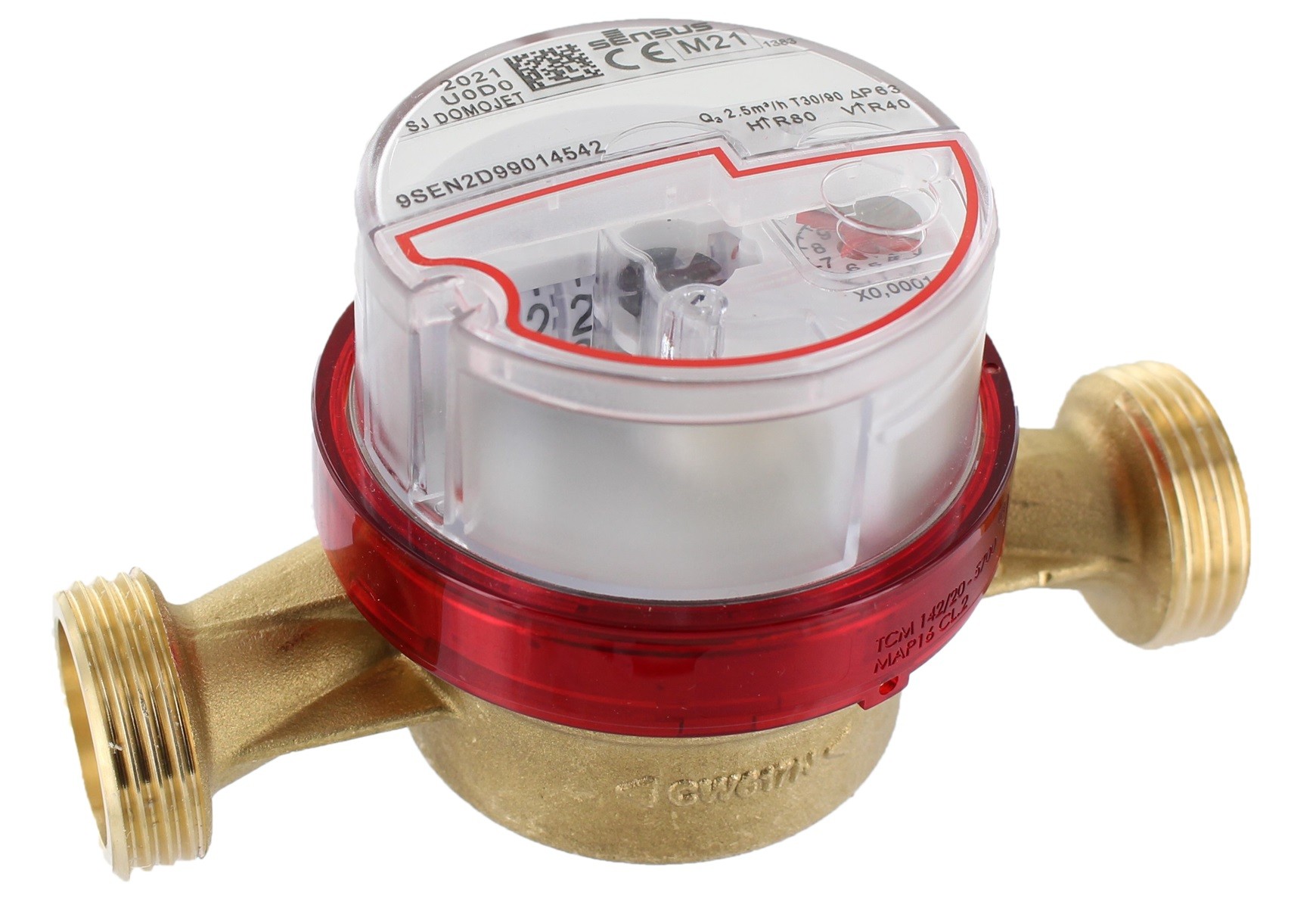 Sensus enkelstråliga vinghjulsmätare för varmvatten DomoJet DN20. Bygglängd 130mm. Anslutning G1" (G25) utvändig gänga. Dimensionerande flöde (Q3) =4 m3/tim. Ratio (R) =80. Mätarhus i mässing. Förberedd för Sensus fjärravläsning med puls, trådad M-Bus eller trådlös wM-Bus (köps separat).