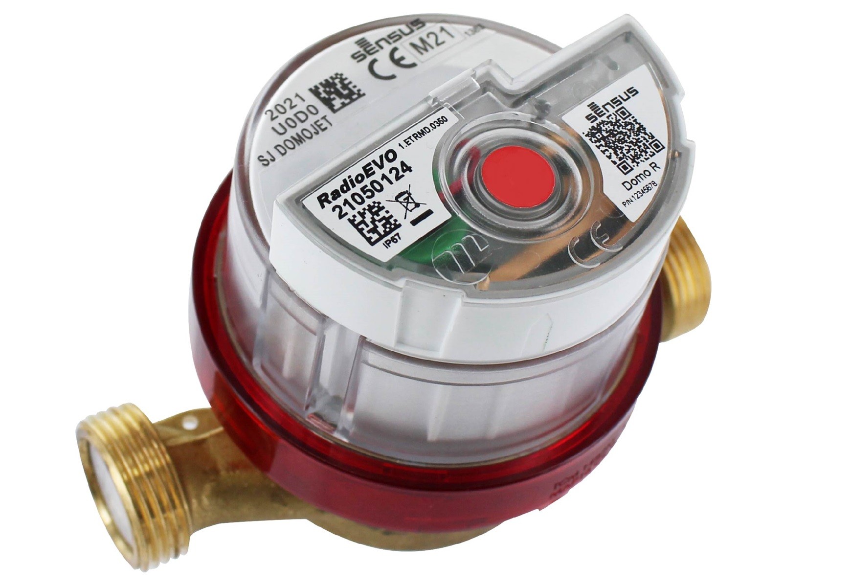 Sensus enkelstråliga vinghjulsmätare för varmvatten DomoJet DN20. Bygglängd 130mm. Anslutning G1" (G25) utvändig gänga. Dimensionerande flöde (Q3) =4 m3/tim. Ratio (R) =80. Mätarhus i mässing. Monterad Sensus fjärravläsning med trådlös wM-Bus.
