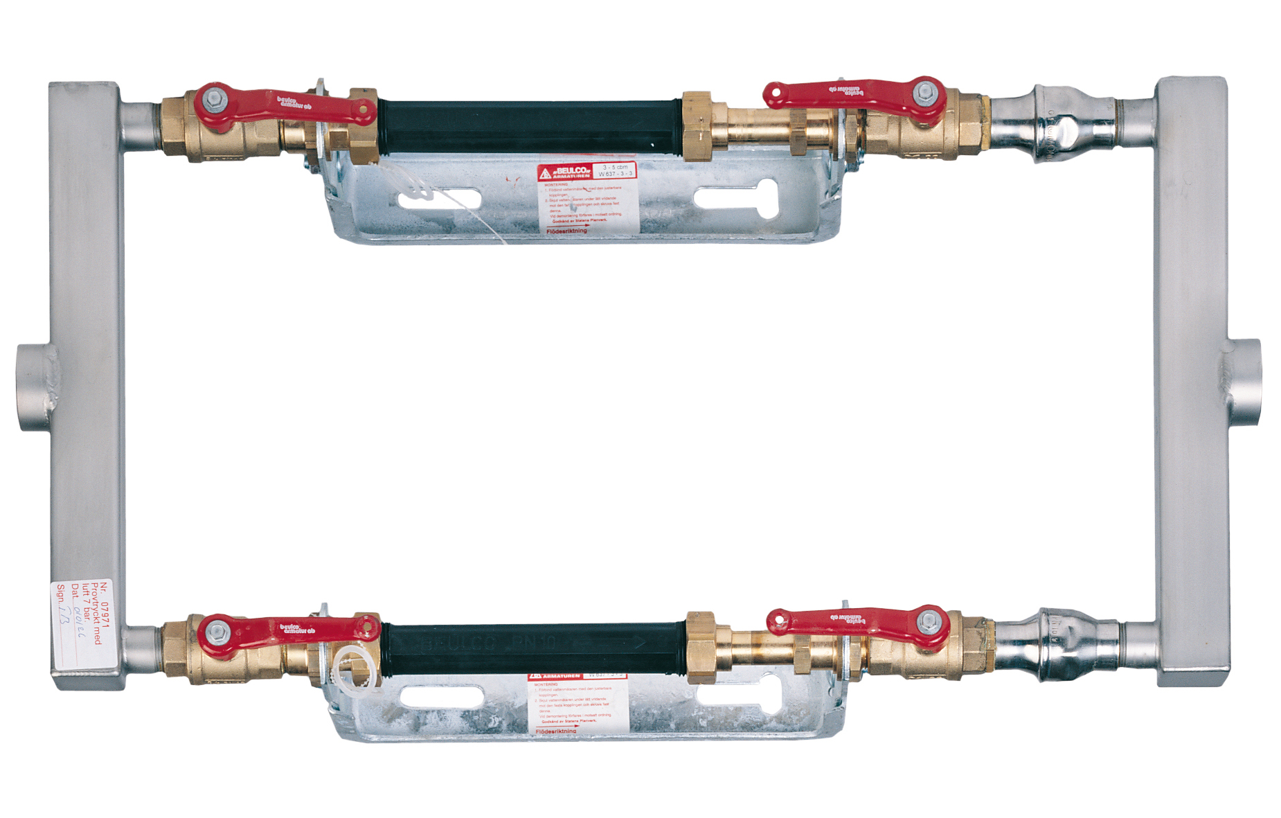Parallellkopplad vattenmätarkonsol för 2 st vattenmätare Q3 4 med bygglängd 190-220mm anslutning G1, kontrollerbar backventil på varje enskild konsol. Genom att stänga ventil före och efter en vattenmätare kan denna demonteras samtidigt som vattenflödet är igång genom den andra mätaren.