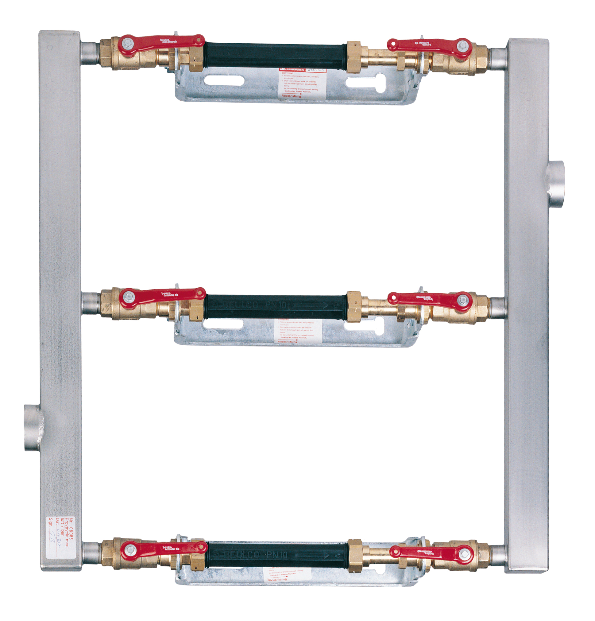 Parallellkopplad vattenmätarkonsol för 3 st vattenmätare Q3 4 med bygglängd 190-220mm anslutning G1. Genom att stänga ventil före och efter en vattenmätare kan denna demonteras samtidigt som vattenflödet är igång genom de andra mätarna.