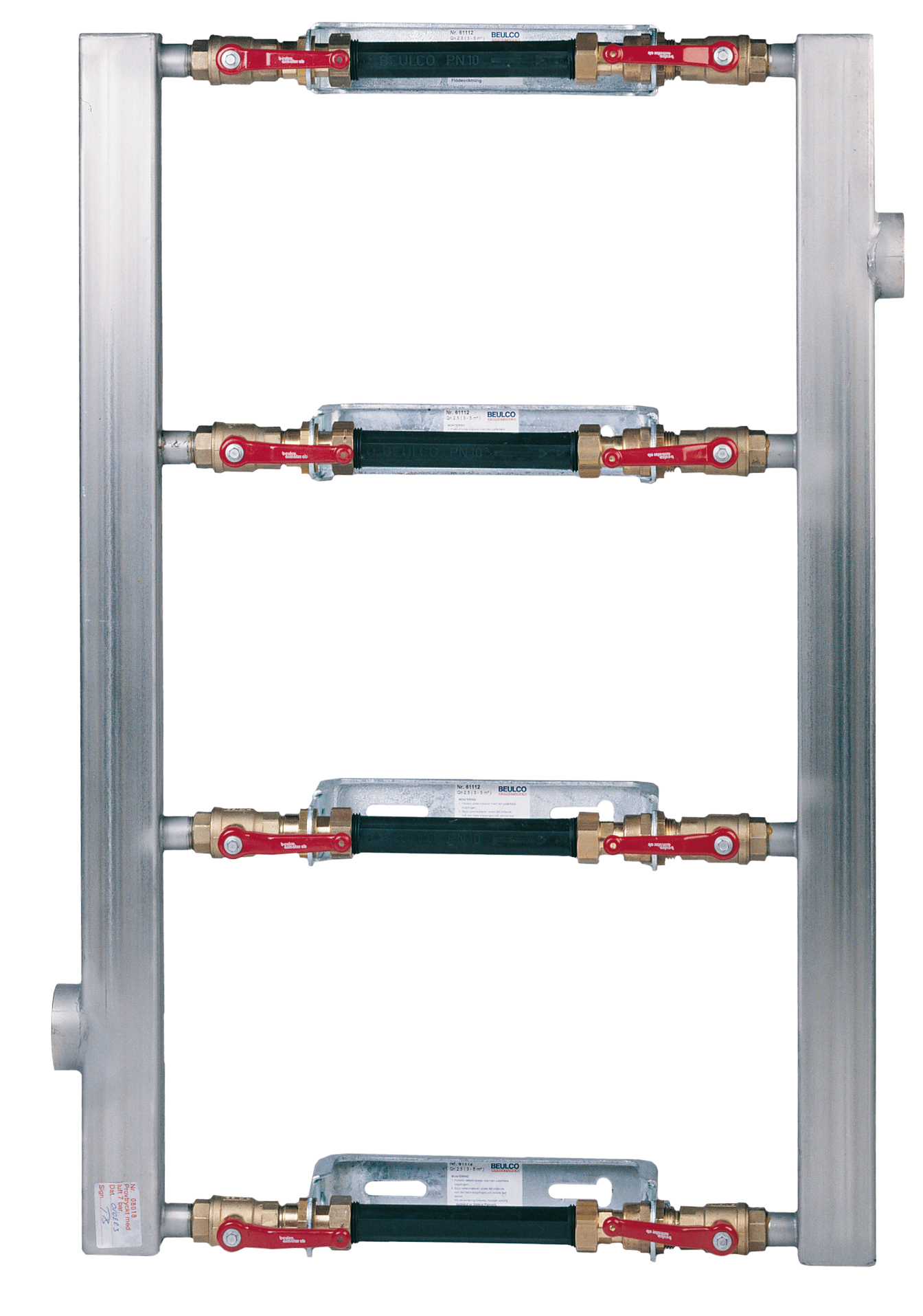 Parallellkopplad vattenmätarkonsol för 4 st vattenmätare Q3 4 med bygglängd 190-220mm anslutning G1. Genom att stänga ventil före och efter en vattenmätare kan denna demonteras samtidigt som vattenflödet är igång genom de andra mätarna.