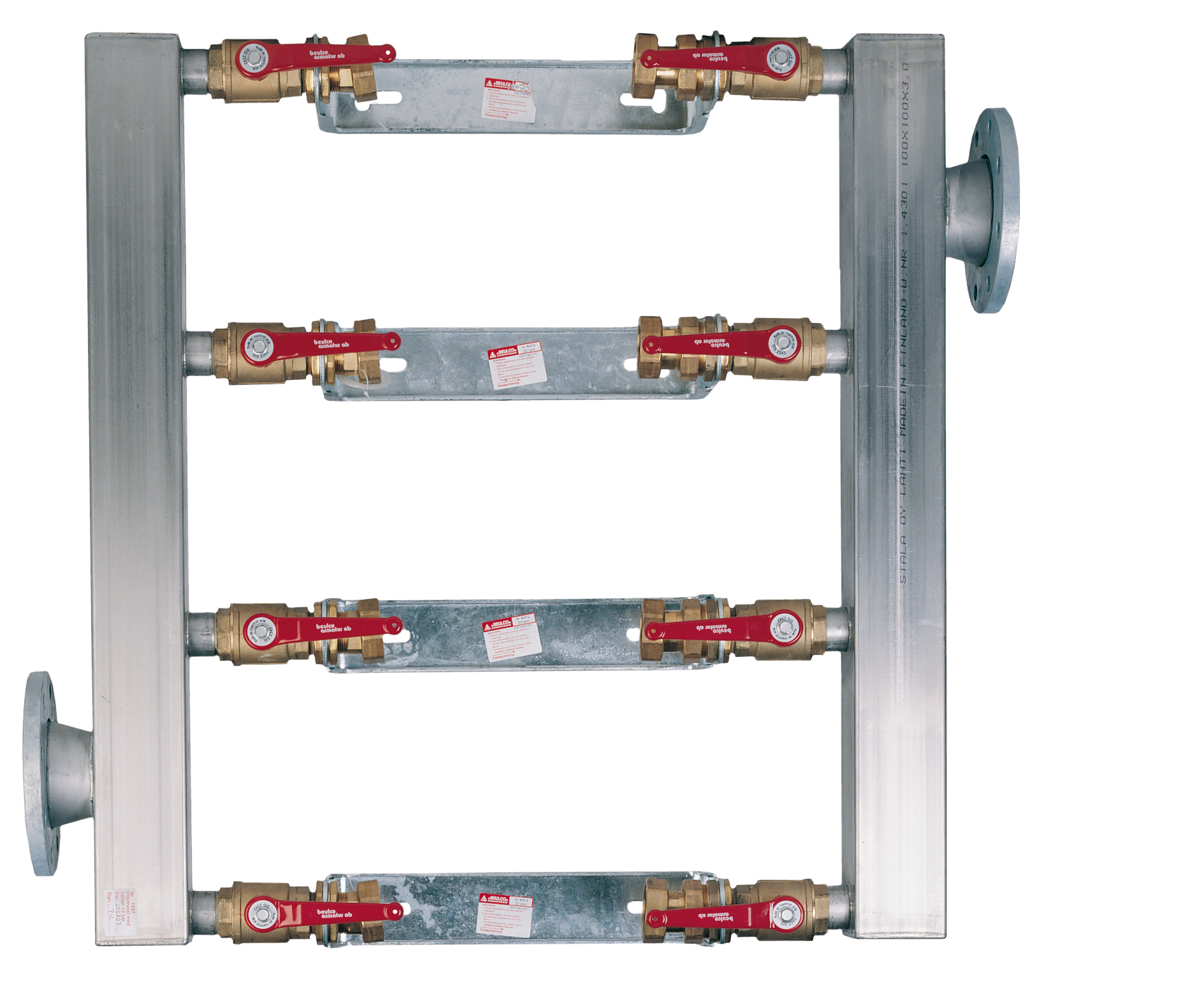 Parallellkopplad vattenmätarkonsol för 4 st vattenmätare Q3 16 med bygglängd 300mm anslutning G2. Genom att stänga ventil före och efter en vattenmätare kan denna demonteras samtidigt som vattenflödet är igång genom de andra mätarna.