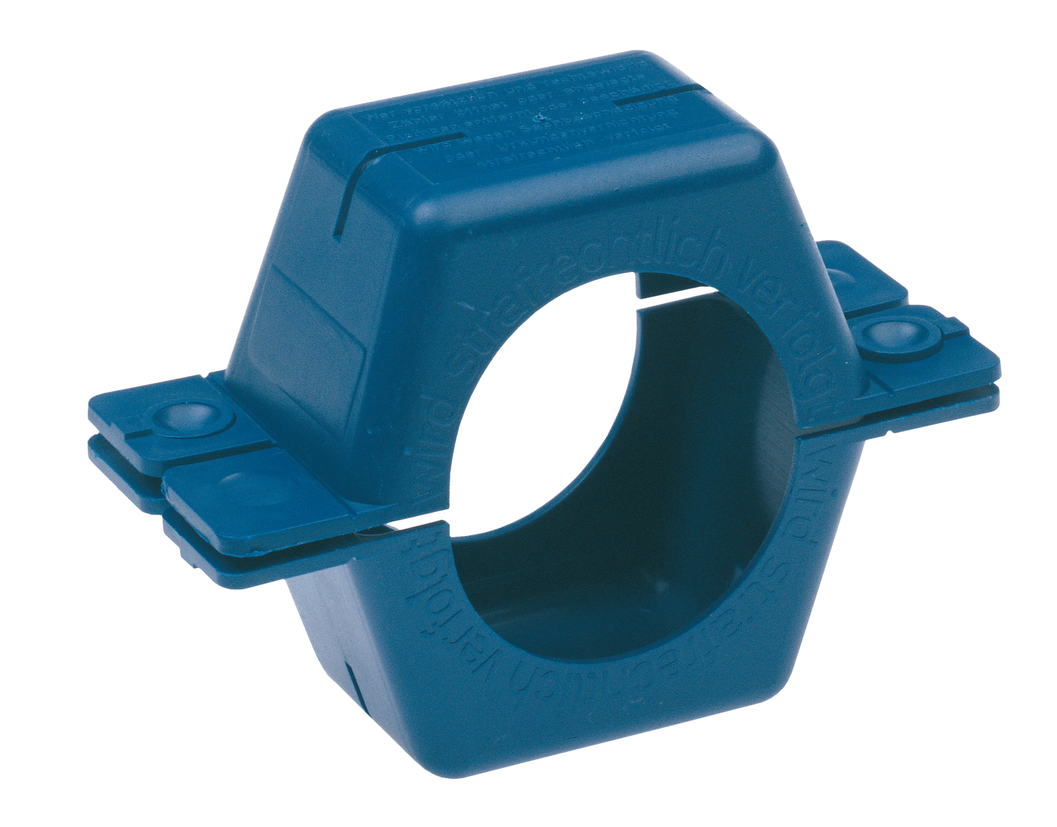 Plomberingsanordning i plast bestående av två halvor för plombering utan tråd av vattenmätare Q3 6,3 (Qn6). Plombering sker genom att den befintliga plastplomben på anordningen trycks till med tång.