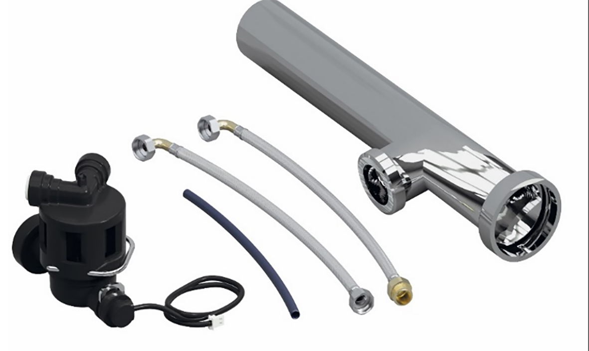 Anslutningsset för installation av Hygbox connect under tvättställ. I paketet ingår två anslutningsslangar för färskvatten, avloppsanslutning med spolslang och avloppsrör med extra anslutning.