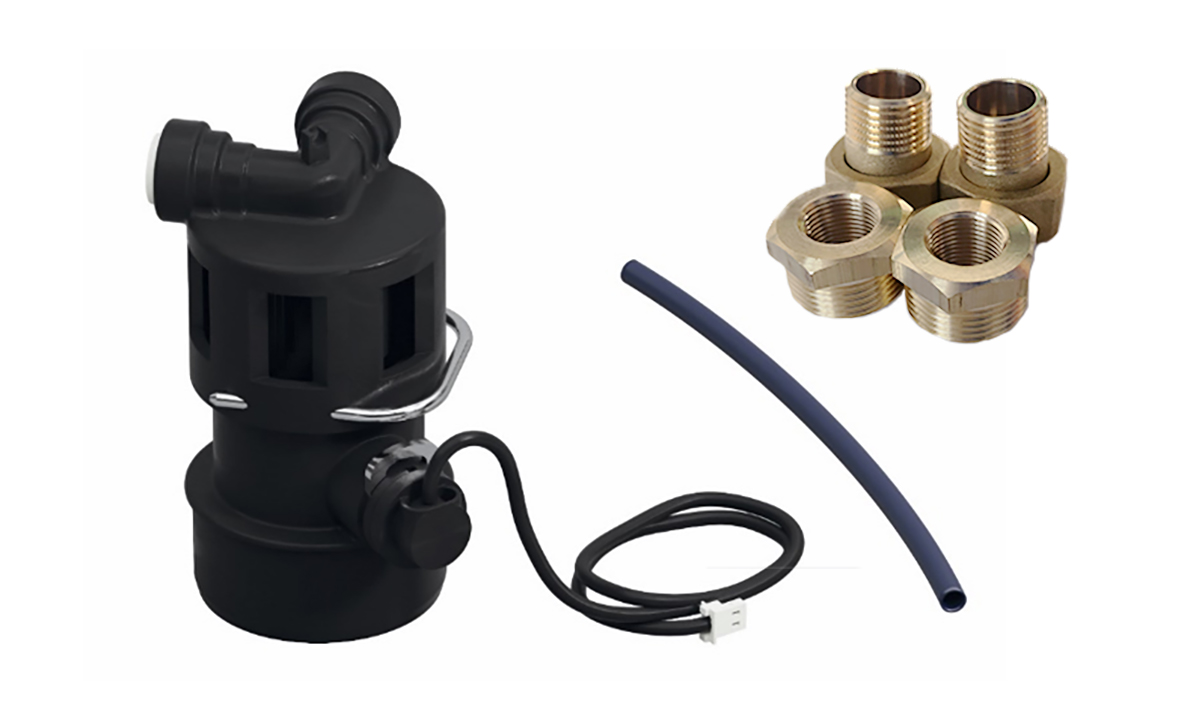 Anslutningsset för installation av Hygbox connect på rör. I paketet ingår avloppsanslutning med spolslang för 40mm avloppsrör samt mässingsdetaljer för att kunna gå upp till R15 på hygbox-enheten.