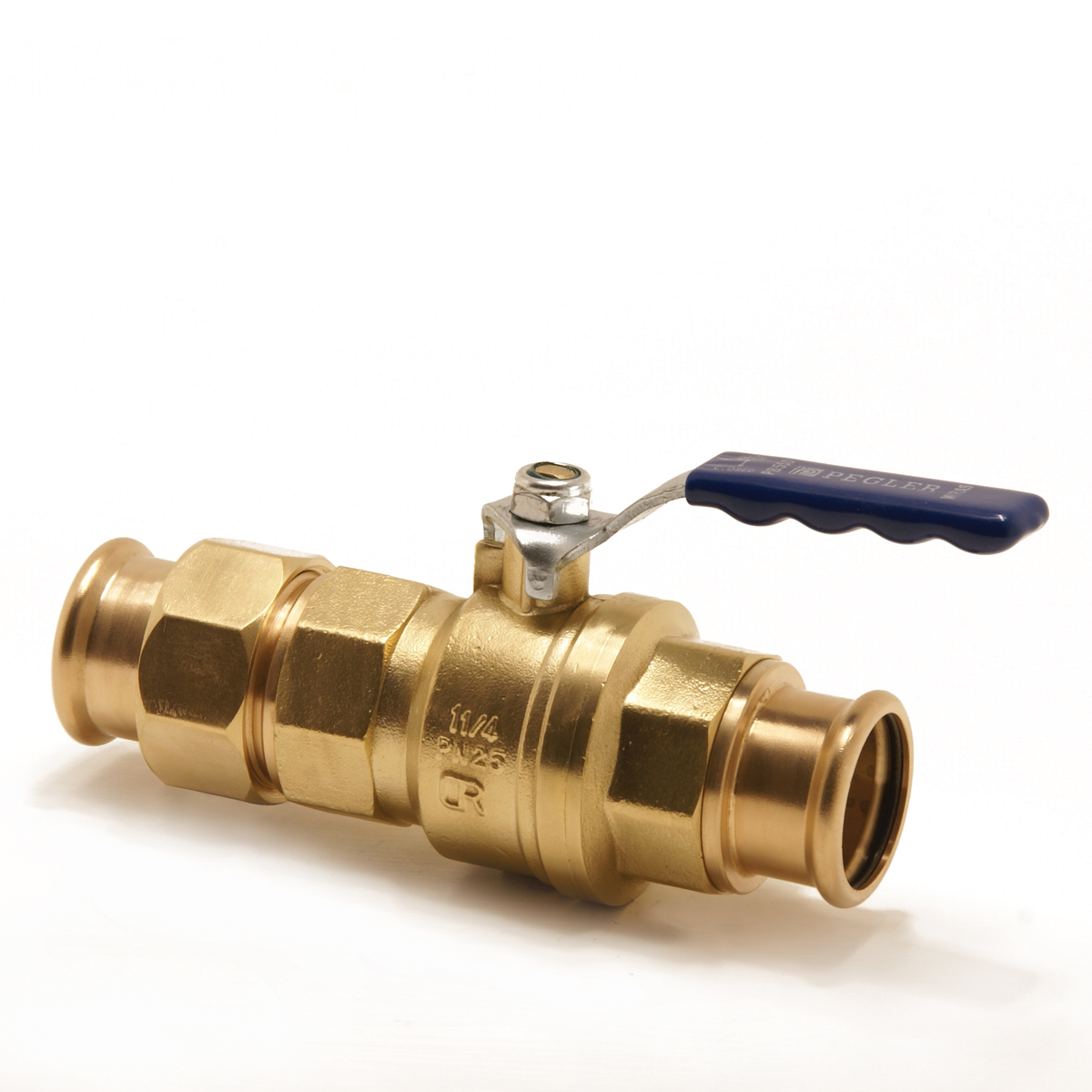 VSH XPress kulventil med fullflödesfunktion i avzinkningshärdig mässing för tappvatten. Blått handtag, pressändar i dimension 42 DN40 med unionkoppling. Användningsområden: