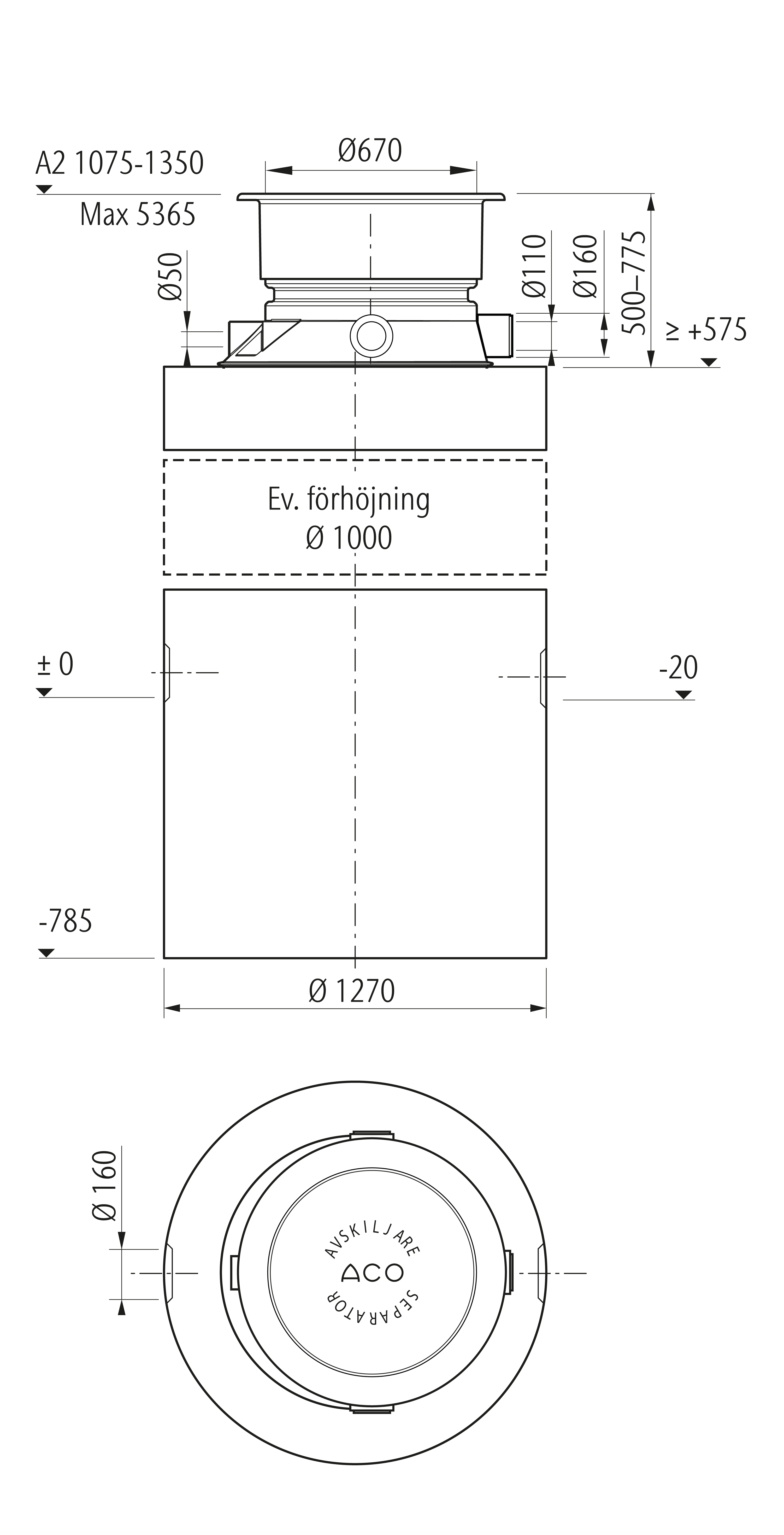 Prefabricerad oljeavskiljare, Klass 1, tillverkad av betong för markförläggning. Avskiljaren levereras komplett med anslutning för ventilation, nedstignings/inspektions och tömningshals, lyftöglor, koalesator, flottörventil och betäckning. A-mått: 1075–1350 mm.