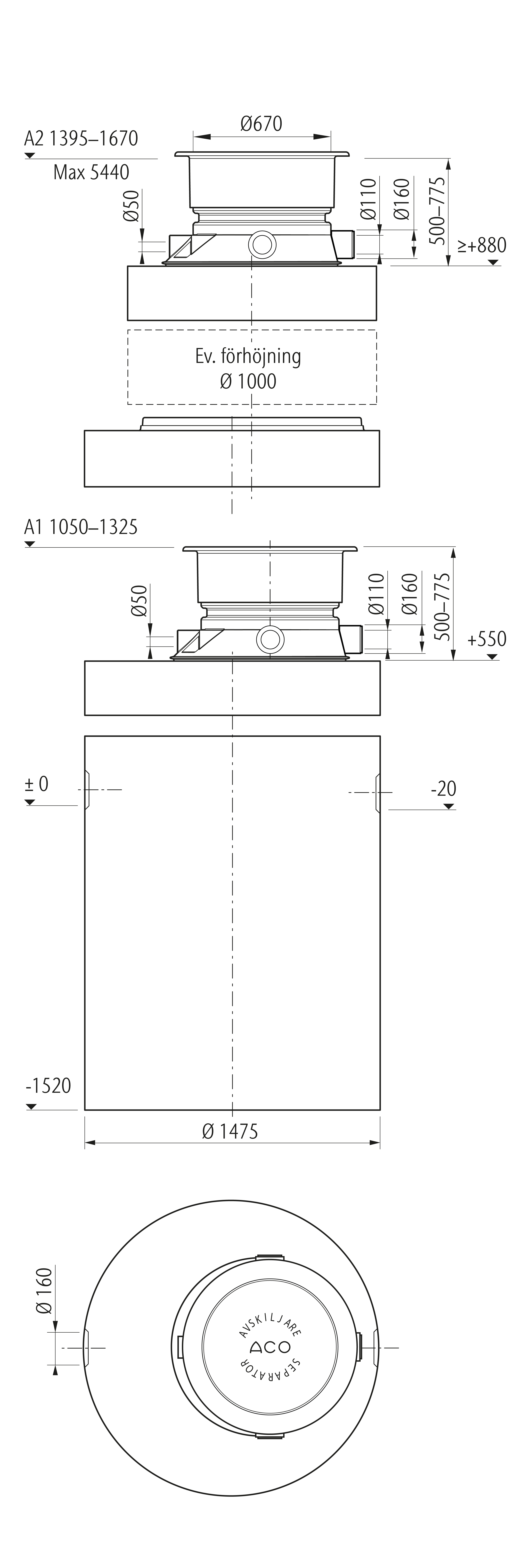 Prefabricerad oljeavskiljare, Klass 1, tillverkad av betong för markförläggning. Avskiljaren levereras komplett med integrerat slamfång, anslutning för ventilation, nedstignings/inspektions och tömningshals, lyftöglor, koalesator, flottörventil och betäckning. A-mått: 1395–1670 mm.