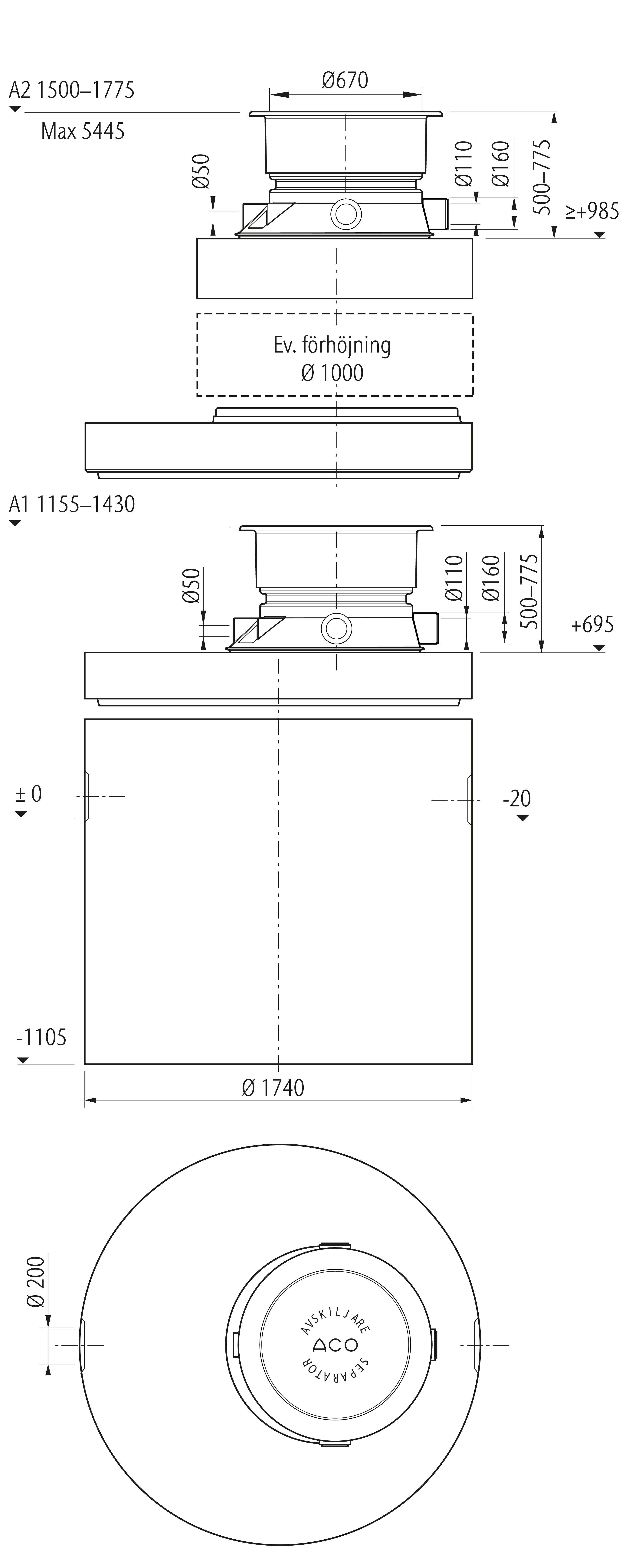 Prefabricerad oljeavskiljare, Klass 1, tillverkad av betong för markförläggning. Avskiljaren levereras komplett med anslutning för ventilation, nedstignings/inspektions och tömningshals, lyftöglor, koalesator, flottörventil och betäckning. A-mått: 1500–1775 mm.