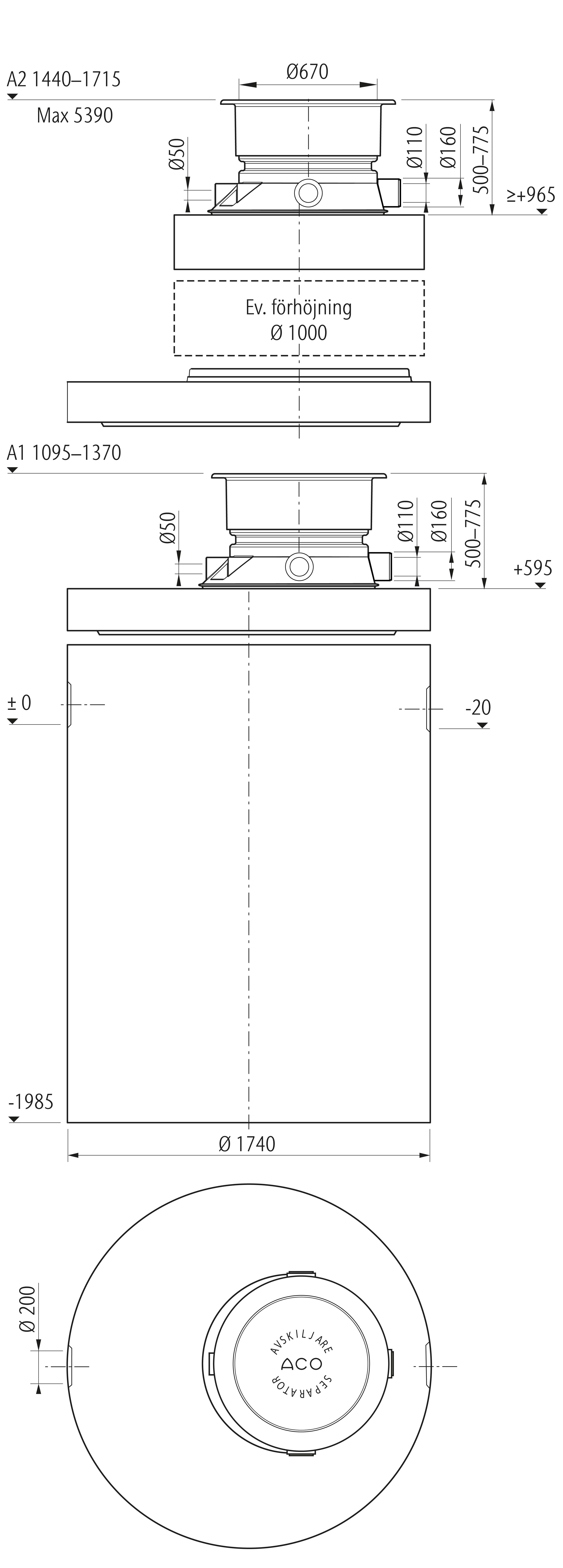 Prefabricerad oljeavskiljare, Klass 1, tillverkad av betong för markförläggning. Avskiljaren levereras komplett med integrerat slamfång, anslutning för ventilation, nedstignings/inspektions och tömningshals, lyftöglor, koalesator, flottörventil och betäckning. A-mått: 1440–1715 mm.