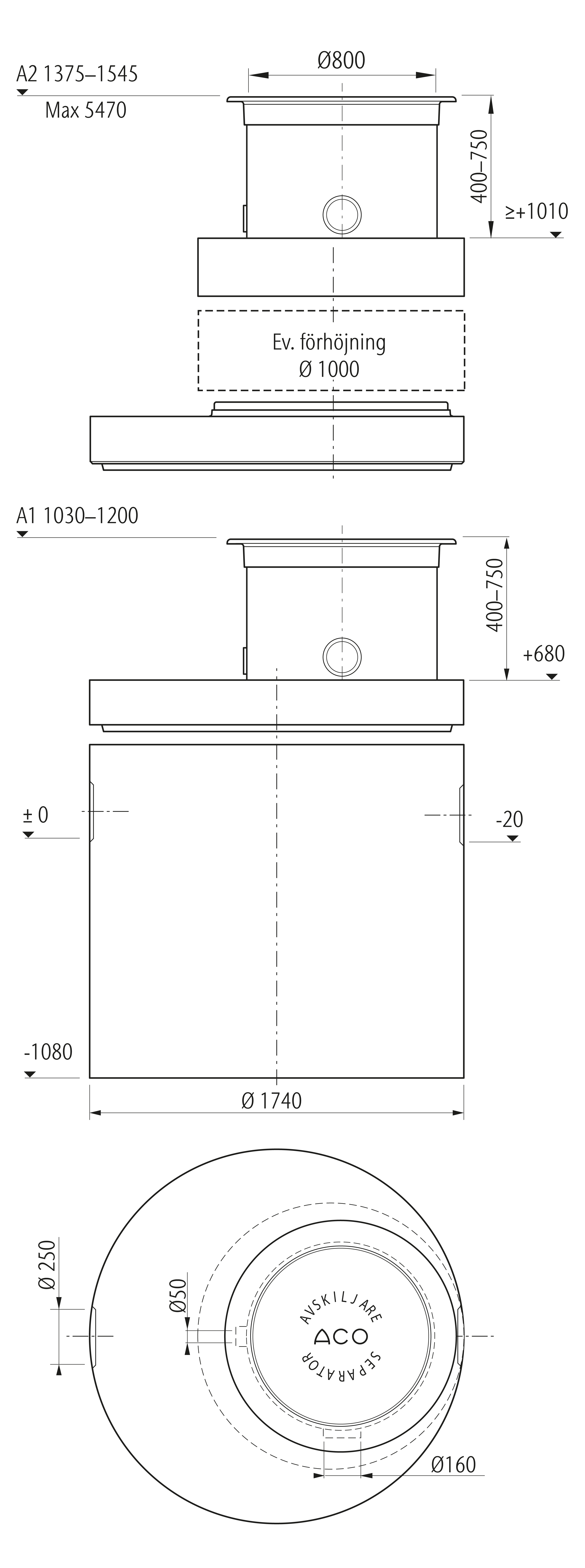 Prefabricerad oljeavskiljare, Klass 1, tillverkad av betong för markförläggning. Avskiljaren levereras komplett med anslutning för ventilation, nedstignings/inspektions och tömningshals, lyftöglor, koalesator, flottörventil och betäckning. A-mått: 1375–1545 mm.