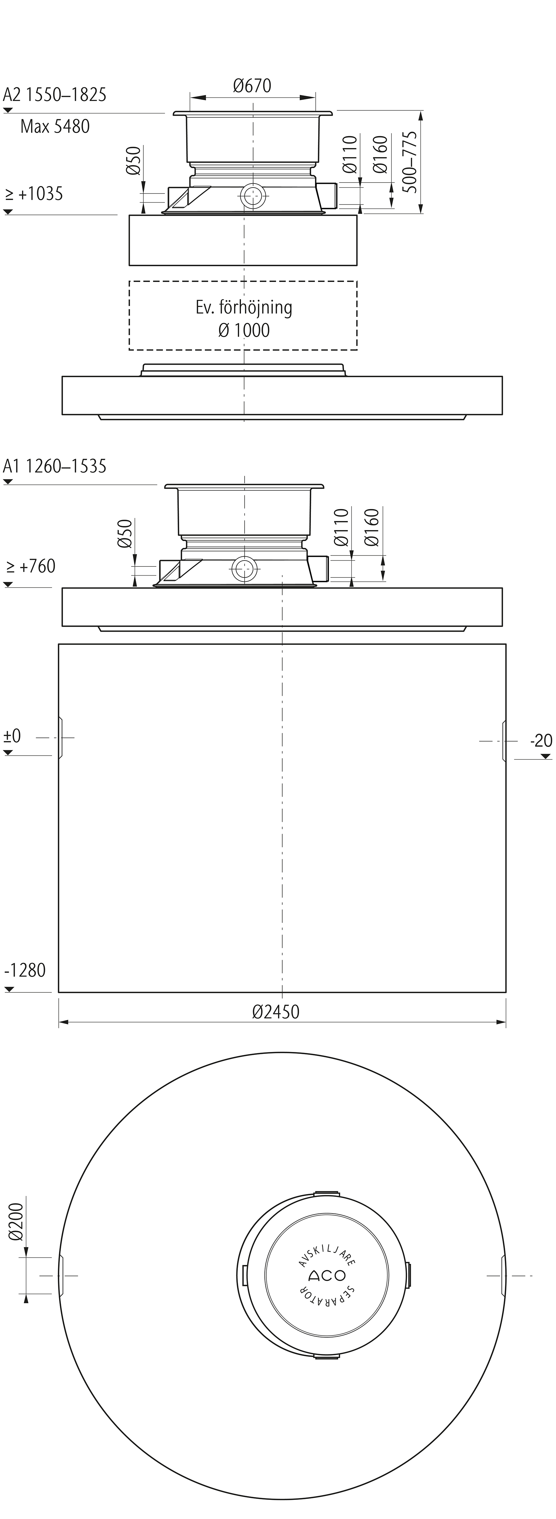 Prefabricerad oljeavskiljare, Klass 1, för extra höga krav på rening. Tillverkad av betong för markförläggning. Avskiljaren levereras komplett med en flerstegs Split Contraction-enhet, integrerat slamfång, anslutning för ventilation, nedstignings/inspektions och tömningshals, lyftöglor, flottörventil och betäckning. A-mått 1550–1825 mm.