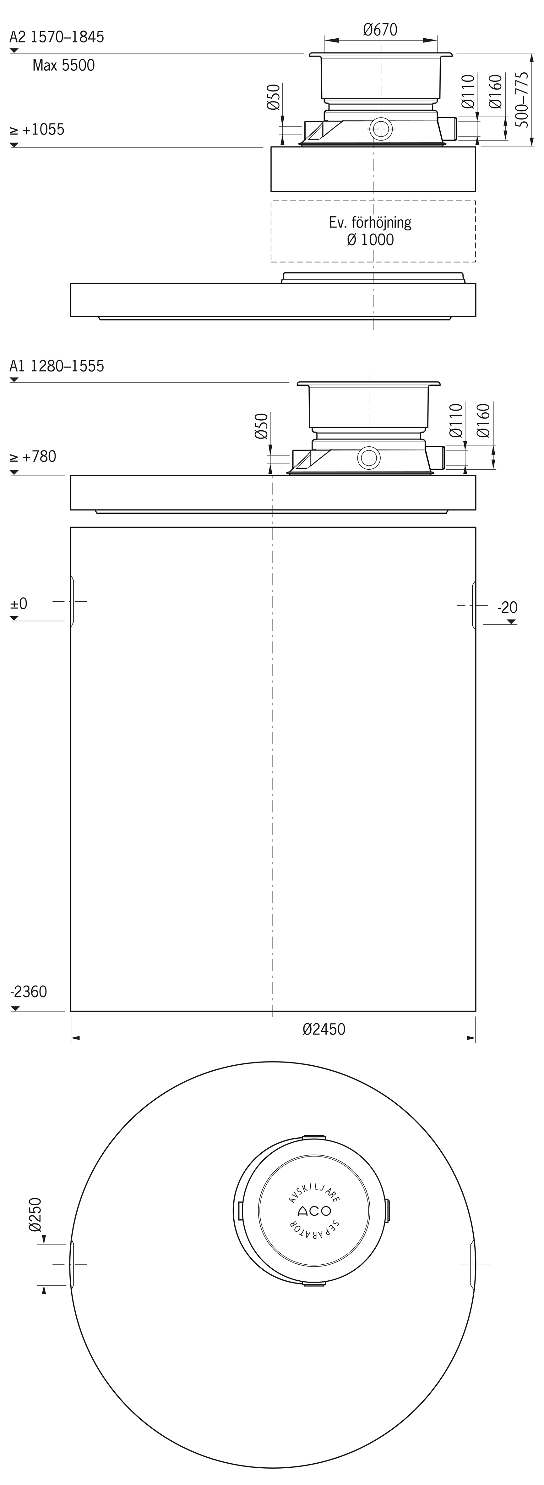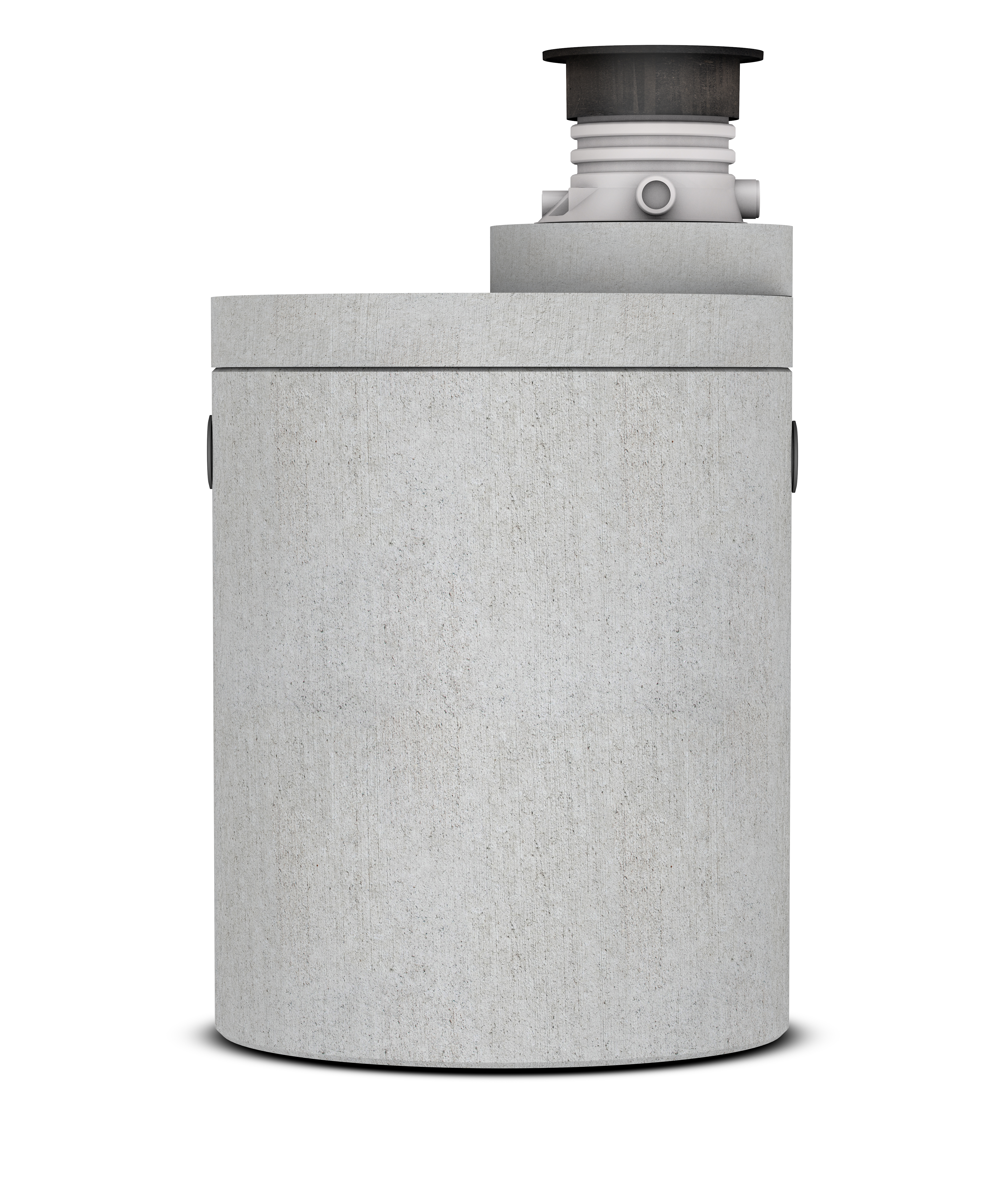 Prefabricerad oljeavskiljare, Klass 1, för extra höga krav på rening. Tillverkad av betong för markförläggning. Avskiljaren levereras komplett med en flerstegs Split Contraction-enhet, integrerat slamfång, anslutning för ventilation, nedstignings/inspektions och tömningshals, lyftöglor, flottörventil och betäckning. A-mått 1570–1845 mm.