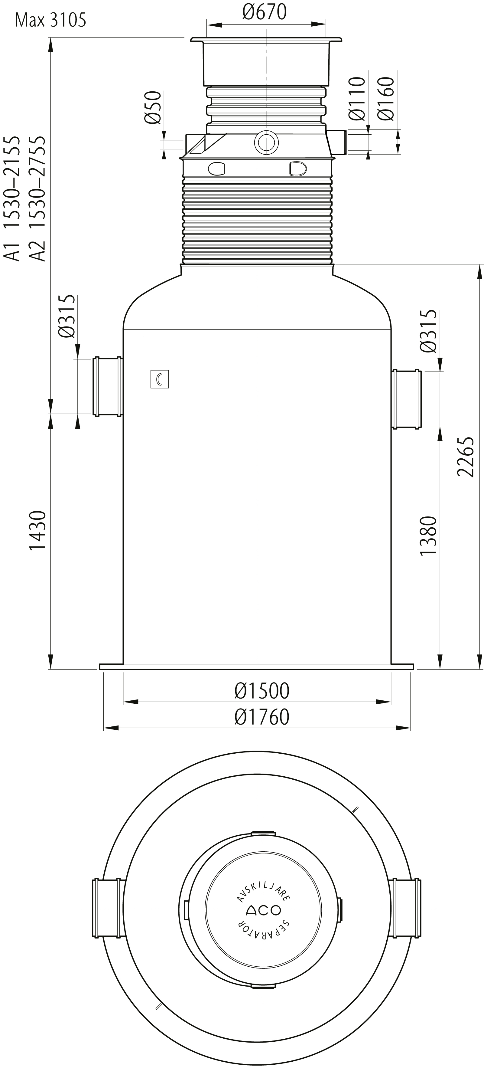 Oleopator Bypass G är avsedd för behandling av oljehaltigt dagvatten med höga krav på reningsgrad. Oleopator Bypass G är en bypass avskiljare, där reglering av flödet sker helt utan rörliga delar. Vid avvattning av större ytor med höga regnflöden är det lämpligt att installera ett bypassystem som leder överskottet förbi avskiljaren som skydd mot överbelastning. A2-mått 1530-2775 mm