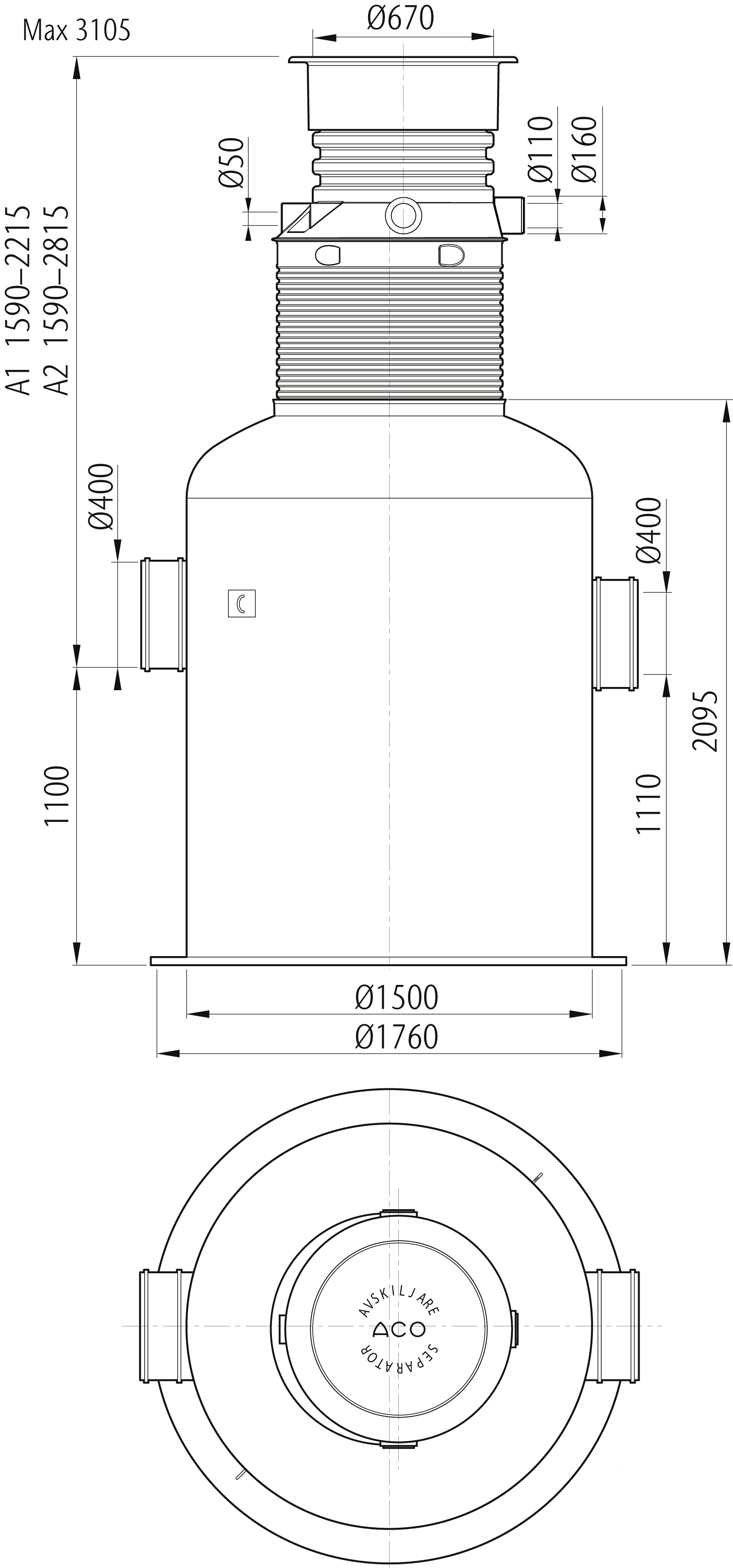 Oleopator Bypass G är avsedd för behandling av oljehaltigt dagvatten med höga krav på reningsgrad. Oleopator Bypass G är en bypass avskiljare, där reglering av flödet sker helt utan rörliga delar. Vid avvattning av större ytor med höga regnflöden är det lämpligt att installera ett bypassystem som leder överskottet förbi avskiljaren som skydd mot överbelastning. A2-mått 1590-2835 mm