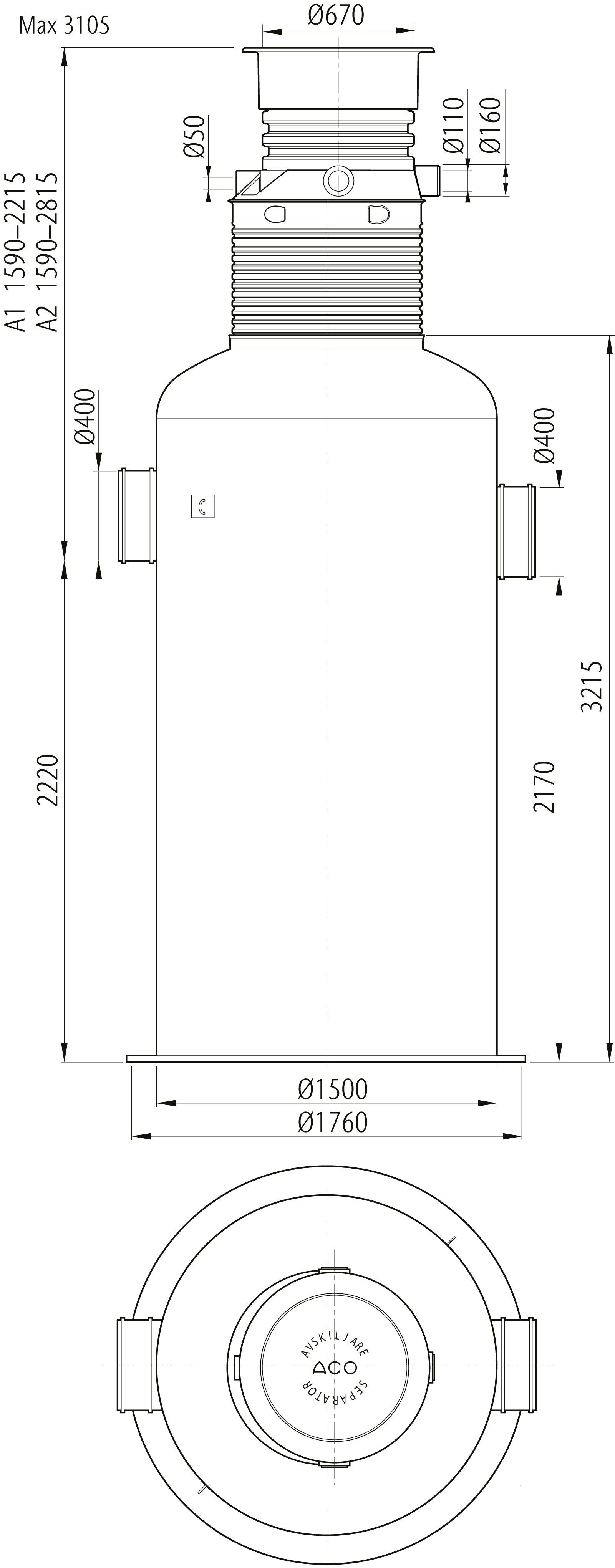 Oleopator Bypass G är avsedd för behandling av oljehaltigt dagvatten med höga krav på reningsgrad. Oleopator Bypass G är en bypass avskiljare, där reglering av flödet sker helt utan rörliga delar. Vid avvattning av större ytor med höga regnflöden är det lämpligt att installera ett bypassystem som leder överskottet förbi avskiljaren som skydd mot överbelastning. A2-mått 1590-2835 mm