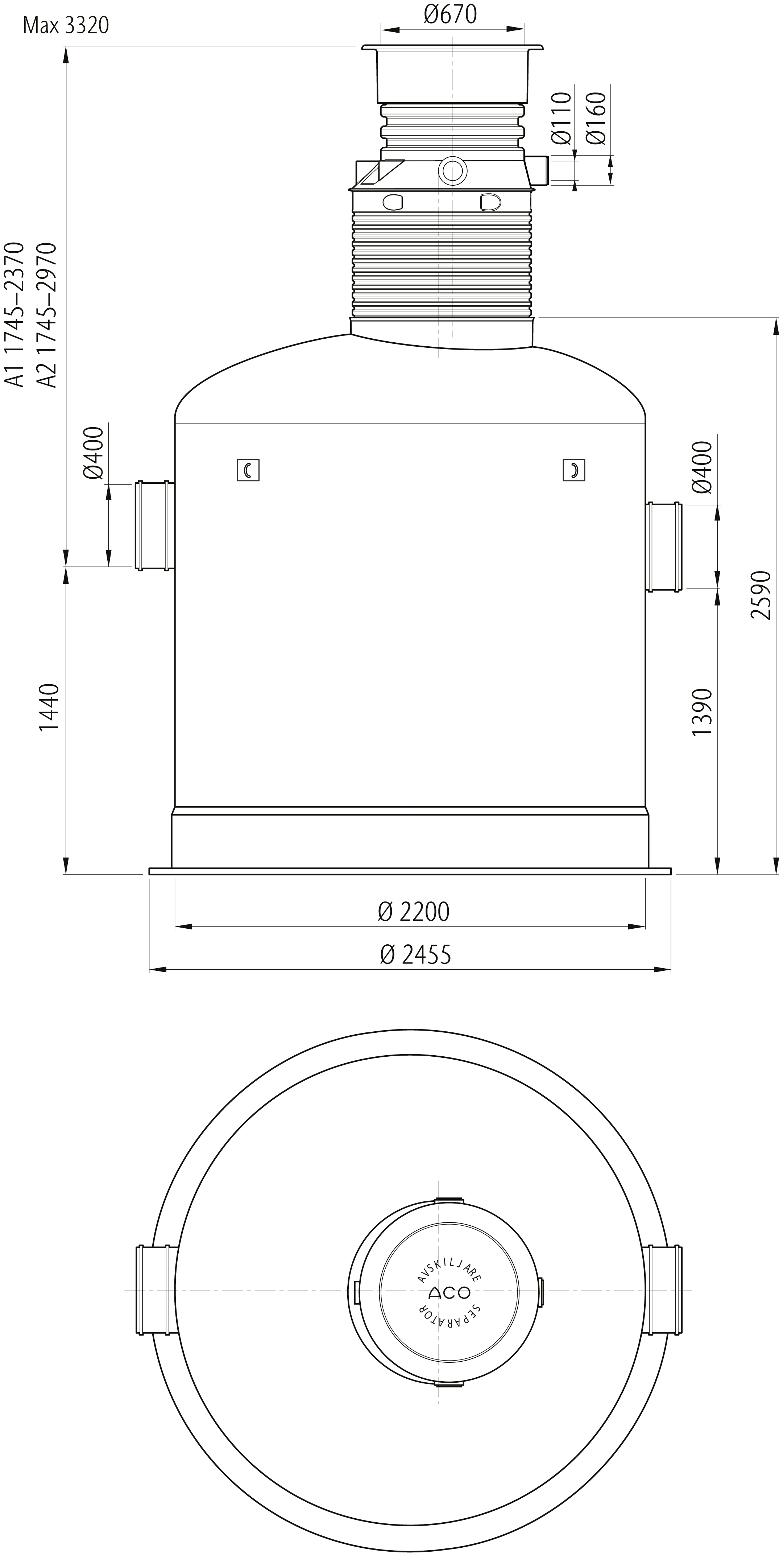Oleopator Bypass G är avsedd för behandling av oljehaltigt dagvatten med höga krav på reningsgrad. Oleopator Bypass G är en bypass avskiljare, där reglering av flödet sker helt utan rörliga delar. Vid avvattning av större ytor med höga regnflöden är det lämpligt att installera ett bypassystem som leder överskottet förbi avskiljaren som skydd mot överbelastning. A1-mått 1745-2370 mm