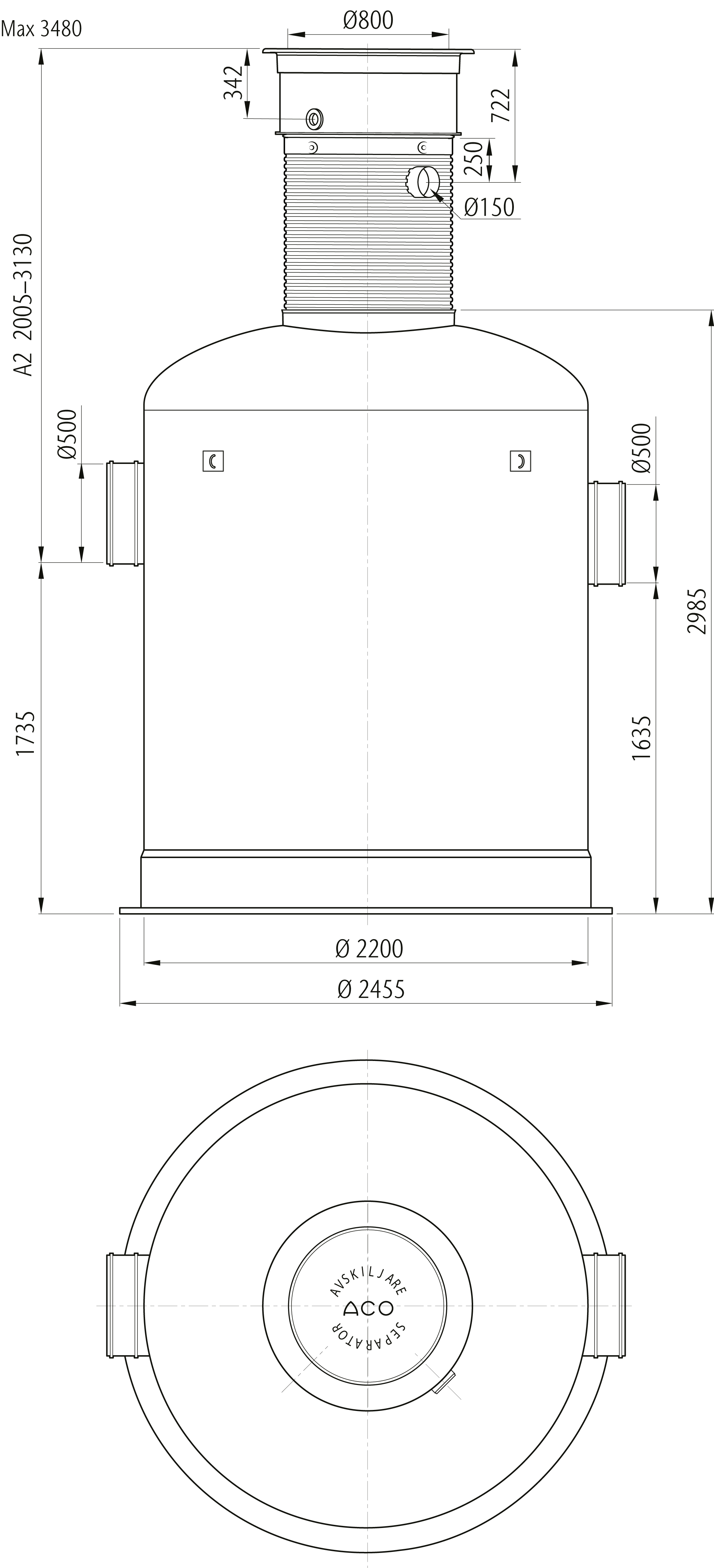 Oleopator Bypass G är avsedd för behandling av oljehaltigt dagvatten med höga krav på reningsgrad. Oleopator Bypass G är en bypass avskiljare, där reglering av flödet sker helt utan rörliga delar. Vid avvattning av större ytor med höga regnflöden är det lämpligt att installera ett bypassystem som leder överskottet förbi avskiljaren som skydd mot överbelastning. A2-mått 2005-3130 mm