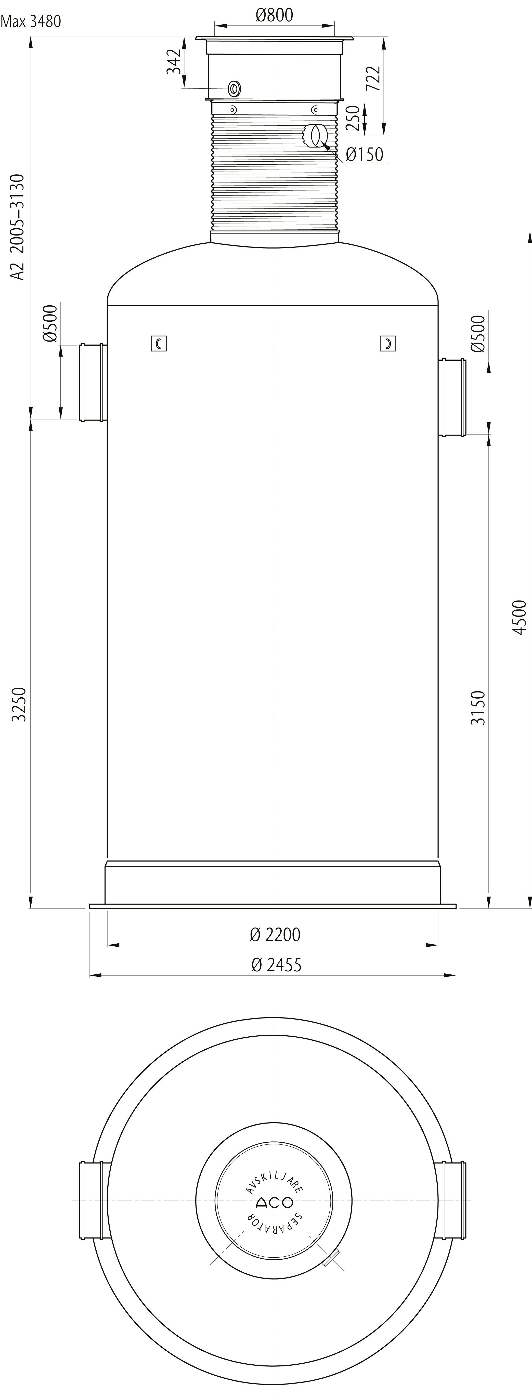 Oleopator Bypass G är avsedd för behandling av oljehaltigt dagvatten med höga krav på reningsgrad. Oleopator Bypass G är en bypass avskiljare, där reglering av flödet sker helt utan rörliga delar. Vid avvattning av större ytor med höga regnflöden är det lämpligt att installera ett bypassystem som leder överskottet förbi avskiljaren som skydd mot överbelastning. A2-mått 2115-3240 mm