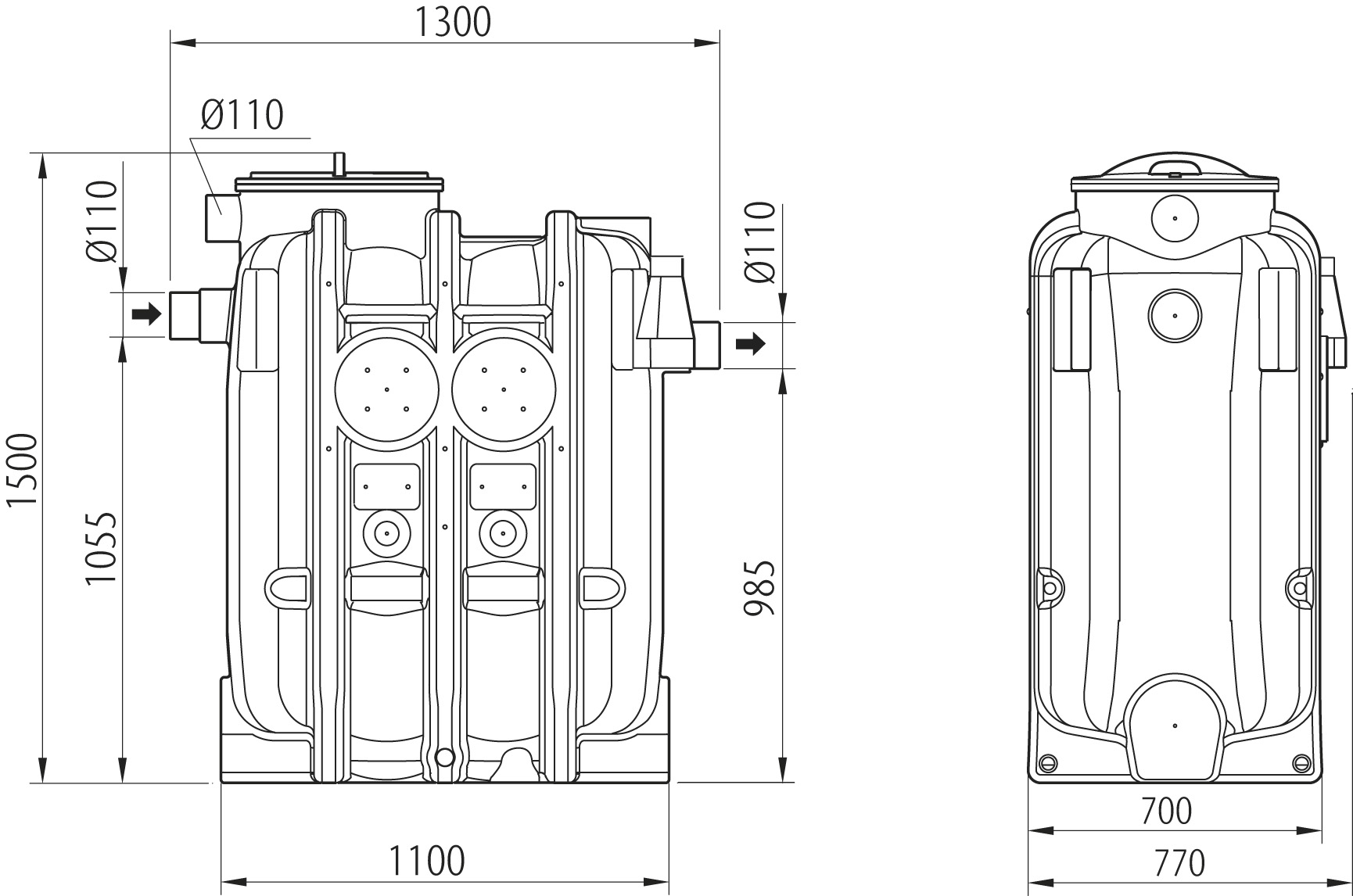 Avskiljaren är avsedd för tömning via slang som förs ner i halsarna. Halsarna, som även är avsedda för inspektion och rengöring, är försedda med lukttäta lock med snabblås.