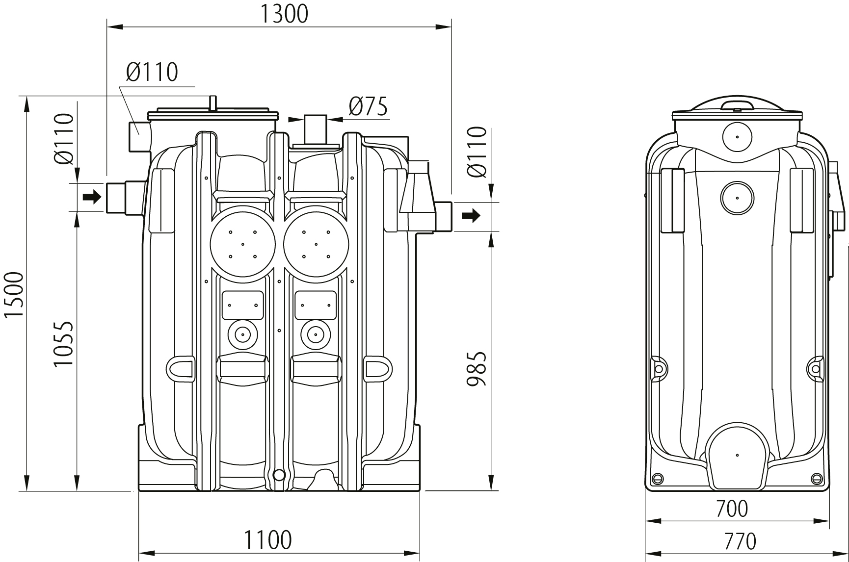 ACO LipuJet P-OD är avsedd för tömning via tömningsrör. Öppningarna, som även är avsedda för inspektion och rengöring, är försedda med lukttäta lock med snabblås.